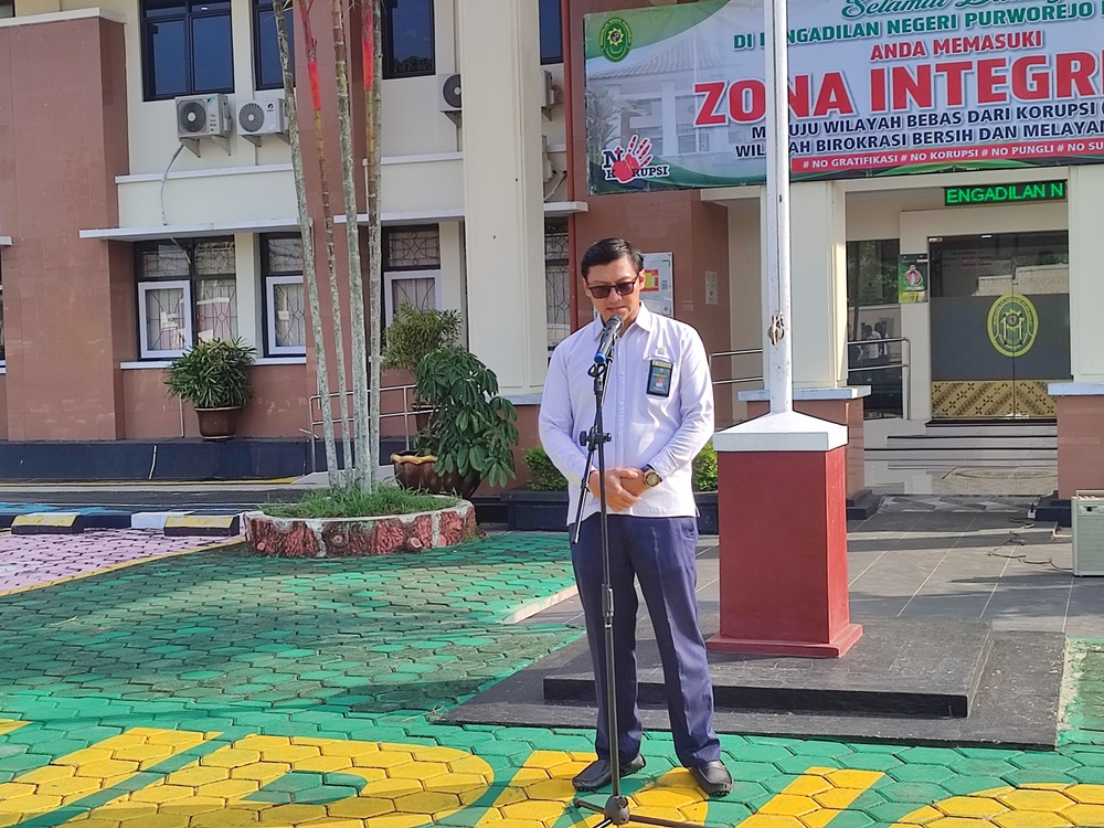 Kegiatan apel pagi dipimpin oleh Wakil Ketua Pengadilan Negeri Purworejo Bapak Hernawan, S.H., M.H. dan diikuti oleh seluruh Aparatur Sipil Negara Pengadilan Negeri Purworejo. Dalam amanatnya, pembina apel menyampaikan bahwa sebagai aparatur peradilan sudah sepatutnya kita tidak hanya memahami, tetapi juga menerapkan secara nyata untuk memperkuat kedisiplinan, integritas, dan pelayanan prima.