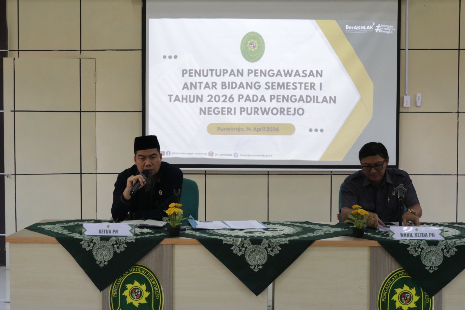 Purworejo - Selasa, 14 April 2026. Pengadilan Negeri Purworejo melaksanakan Penutupan Pengawasan Antar Bidang Semester 1 Tahun 2026 bertempat di Aula Pengadilan Negeri Purworejo. Kegiatan ini dipimpin oleh Bapak Erwindu, S.H. selaku Ketua Tim dan Bapak Hernawan, S.H., M.H. selaku Koordinator Hakim Pengawas Antar Bidang serta dihadiri oleh seluruh keluarga besar Pengadilan Negeri Purworejo bertempat di Aula Pengadilan Negeri Purworejo.