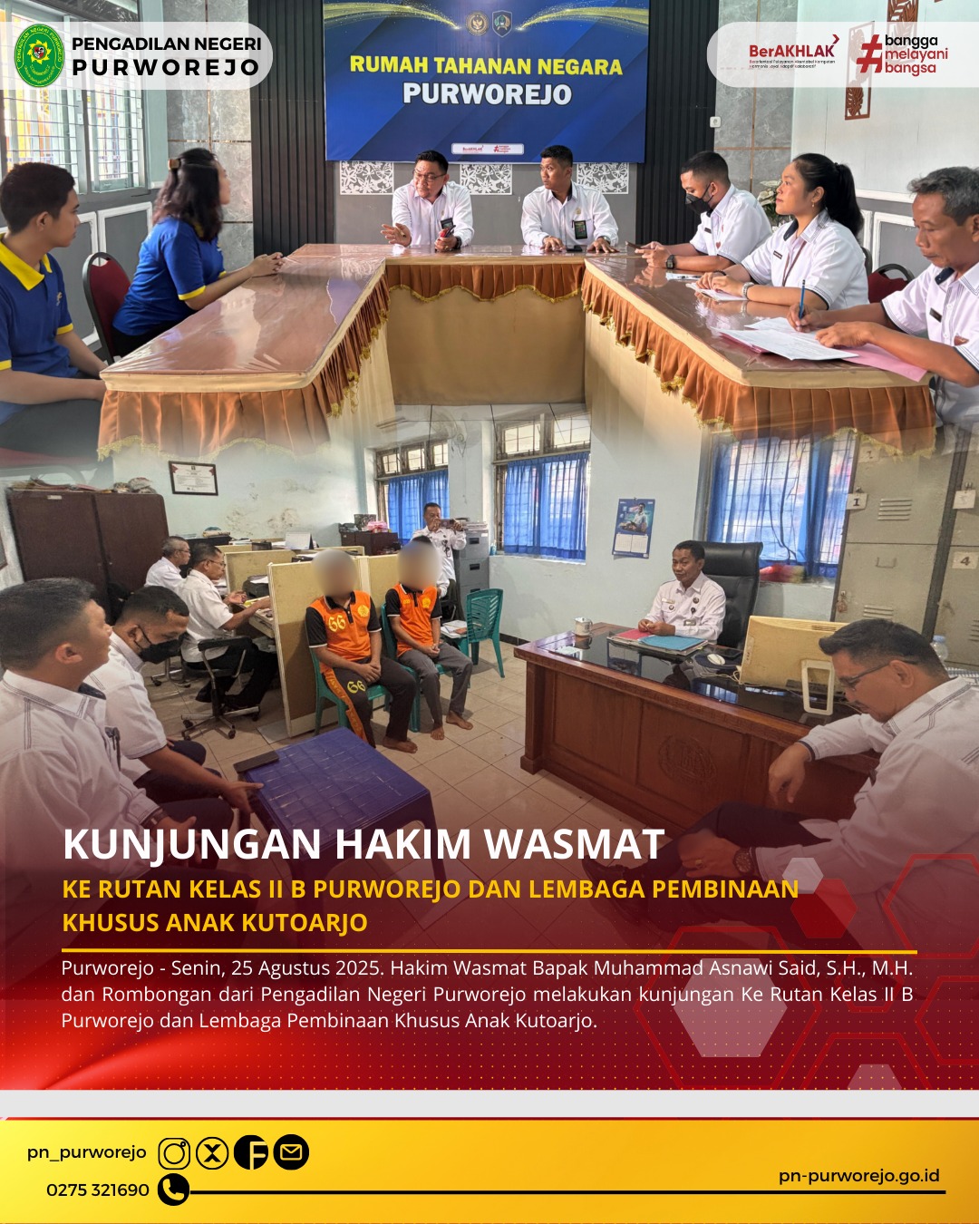 Purworejo - Senin, 25 Agustus 2025. Hakim Wasmat Bapak Muhammad Asnawi Said, S.H., M.H. dan Rombongan dari Pengadilan Negeri Purworejo melakukan kunjungan Ke Rutan Kelas II B Purworejo dan Lembaga Pembinaan Khusus Anak Kutoarjo.