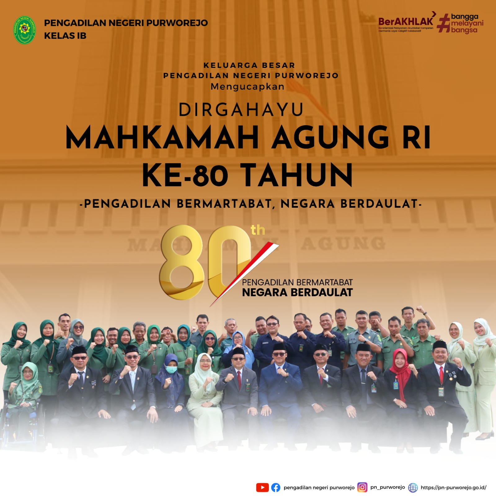 Keluarga Besar Pengadilan Negeri Purworejo mengucapkan Selamat Hari Ulang Tahun Mahkamah Agung Republik Indonesia ke 80 Tahun.