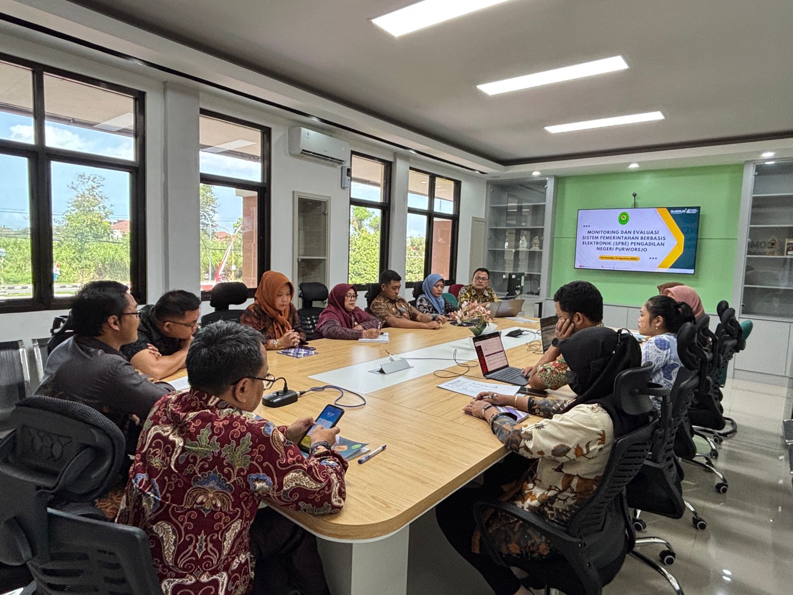 Purworejo - Kamis, 14 Agustus 2025. Bertempat di Command Center Pengadilan Negeri Purworejo melaksanakan Monitoring dan Evaluasi Sistem Pemerintahan Berbasis Elektronik (SPBE) Pengadilan Negeri Purworejo yang dipimpin oleh Ketua dan Wakil Pengadilan Negeri Purworejo serta hadiri oleh tim monitoring dan evaluasi SPBE.