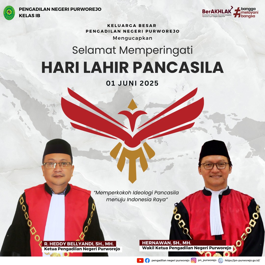Keluarga Besar Pengadilan Negeri Purworejo mengucapkan Selamat Memperingati Hari Lahir Pancasila. Memperkokoh Ideologi Pancasila Menuju Indonesia Raya.