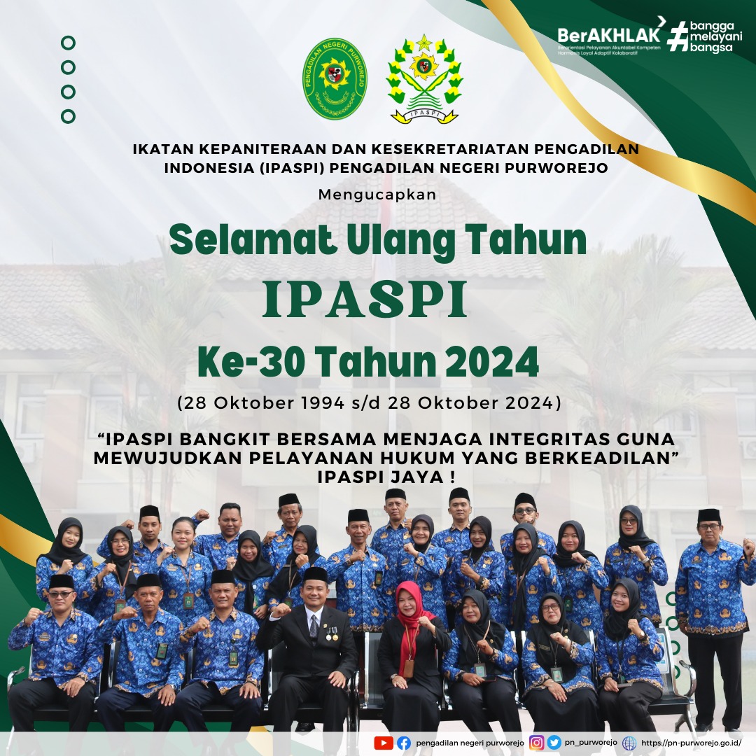 Ikatan Kepaniteraan dan Kesekretariatan Pengadilan Indonesia (IPASPI) Pengadilan Negeri Purworejo mengucapkan Selamat Ulang Tahun IPASPI ke -30 Tahun 2024 (28 Oktober 1994 s/d 28 Oktober 2024).