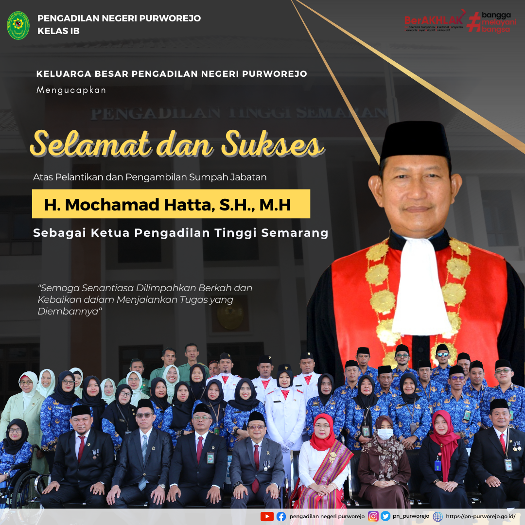 Keluarga Besar Pengadilan Negeri Purworejo mengucapkan Selamat dan Sukses Atas Pelantikan dan Pengambilan Sumpah Jabatan Bapak H. Mochamad Hatta, S.H., M.H. sebagai Ketua Pengadilan Tinggi Semarang. Semoga senantiasa dilimpahkan berkah dan kebaikan dalam menjalankan tugas yang diembannya.