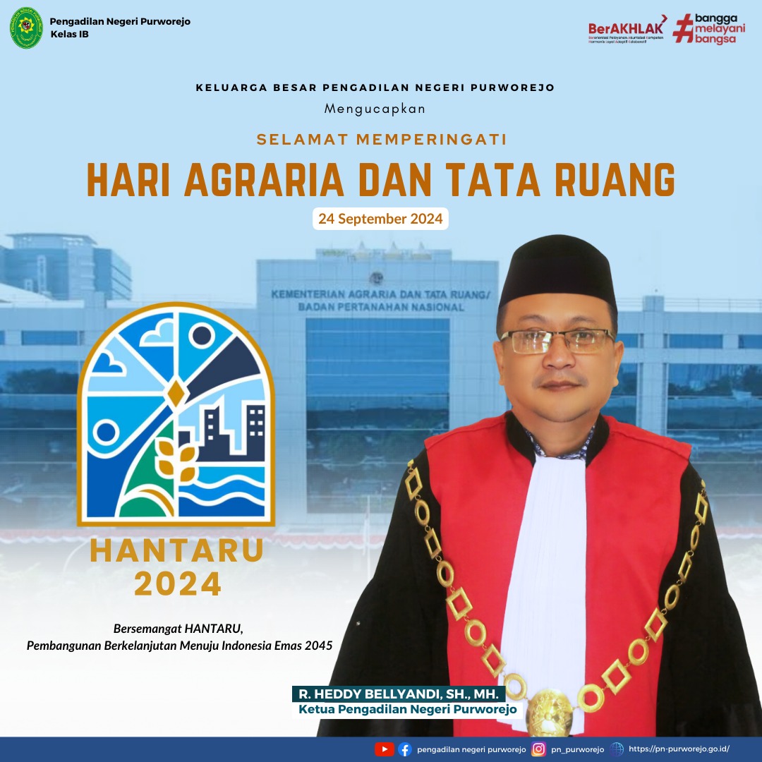 Keluarga Besar Pengadilan Negeri Purworejo mengucapkan Selamat Memperingati Hari Agraria dan Tata Ruang Tahun 2024. Bersemangat HANTARU, Pembangunan Berkelanjutan Menuju Indonesia Emas 2045.