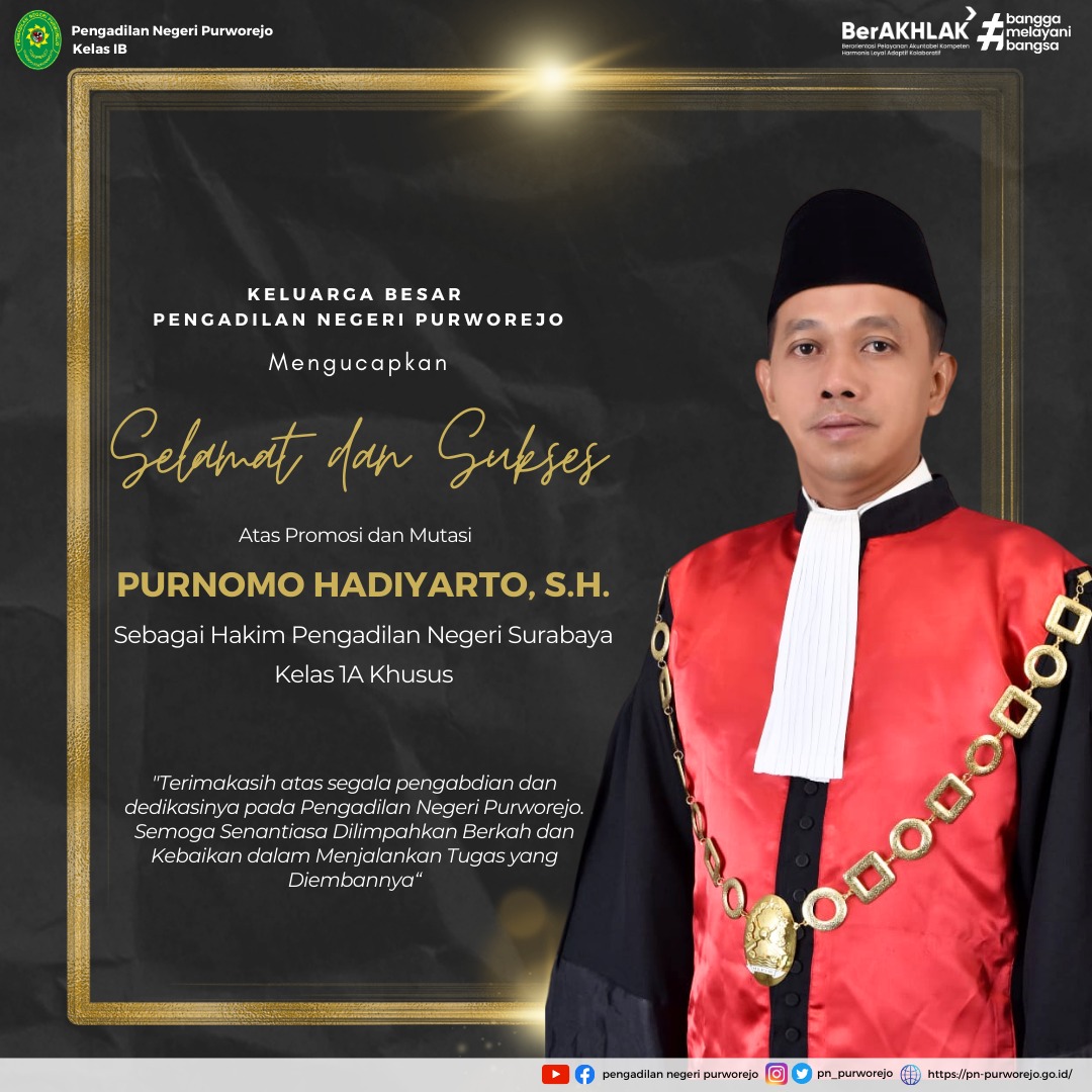 Keluarga Besar Pengadilan Negeri mengucapkan Selamat dan Sukses atas Promosi dan Mutasi Bapak Purnomo Hadiyarto, S.H. sebagai Hakim Pengadilan Negeri Surabaya Kelas 1A Khusus.