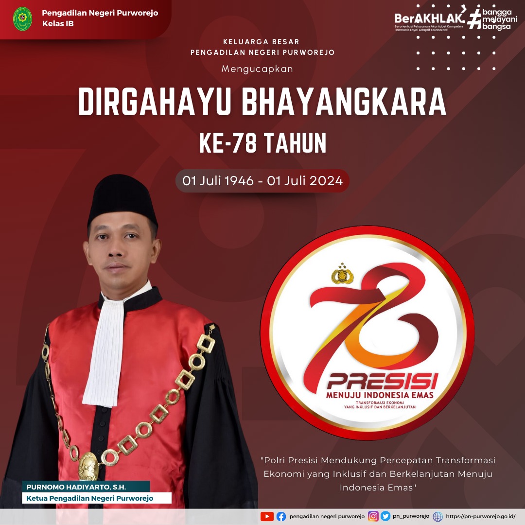 Keluarga Besar Pengadilan Negeri Purworejo mengucapkan Dirgahayu Bhayangkara ke – 78 Tahun 01 Juli 2024. "Polri Presisi Mendukung Percepatan Transformasi Ekonomi yang Inklusif dan Berkelanjutan Menuju Indonesia Emas".