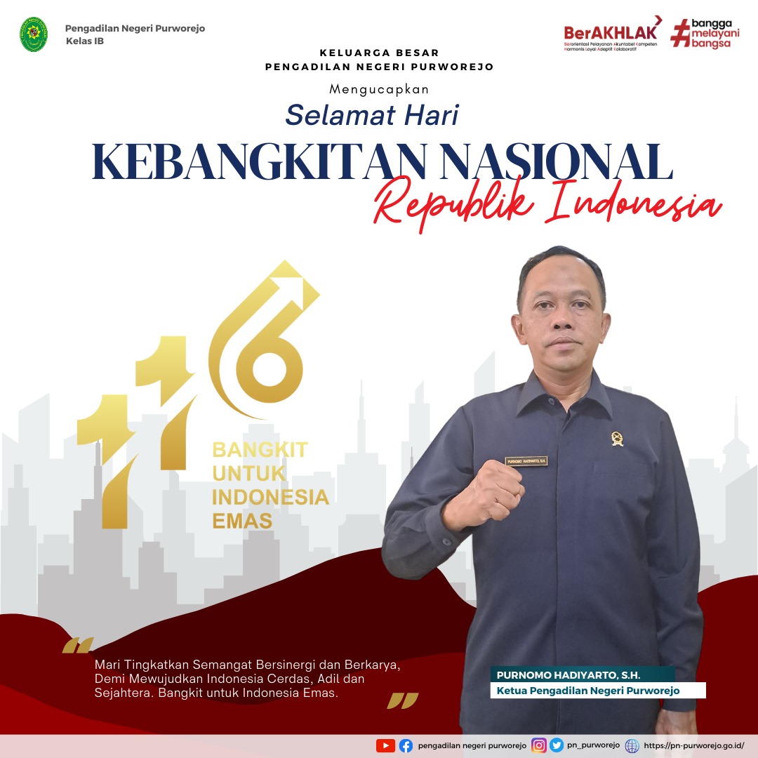 Purworejo – Senin, 20 Mei 2024. Keluarga Besar Pengadilan Negeri Purworejo mengucapkan Selamat Hari Kebangkitan Nasional Republik Indonesia. Mari Tingkatkan Semangat Bersinergi dan Berkarya, Demi Mewujudkan Indonesia Cerdas, Adil dan Sejahtera. Bangkit untuk Indonesia Emas.