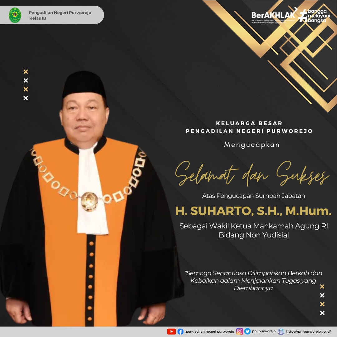 Purworejo - Kamis, 16 Mei 2024. Keluarga Besar Pengadilan Purworejo mengucapkan Selamat dan Sukses atas Pengucapan Sumpah Jabatan Bapak H. Suharto, S.H., M.Hum. sebagai Wakil Ketua Mahkamah Agung RI Bidang Non Yudisial. Semoga Senantiasa Dilimpahkan Berkah dan Kebaikan dalam Menjalankan Tugas yang Diembannya.