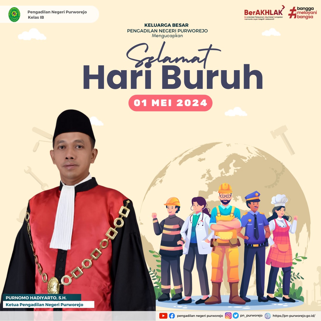 Keluarga Besar Pengadilan Negeri Purworejo mengucapkan Selamat Hari Buruh 1 Mei 2024. Mari Tingkatkan Tekad dan Semangat Kerja untuk Meraih Masa Depan yang Lebih Bahagia dan Sejahtera.
