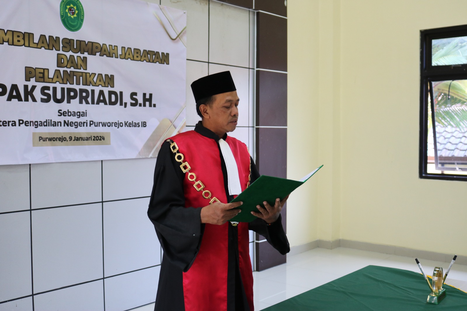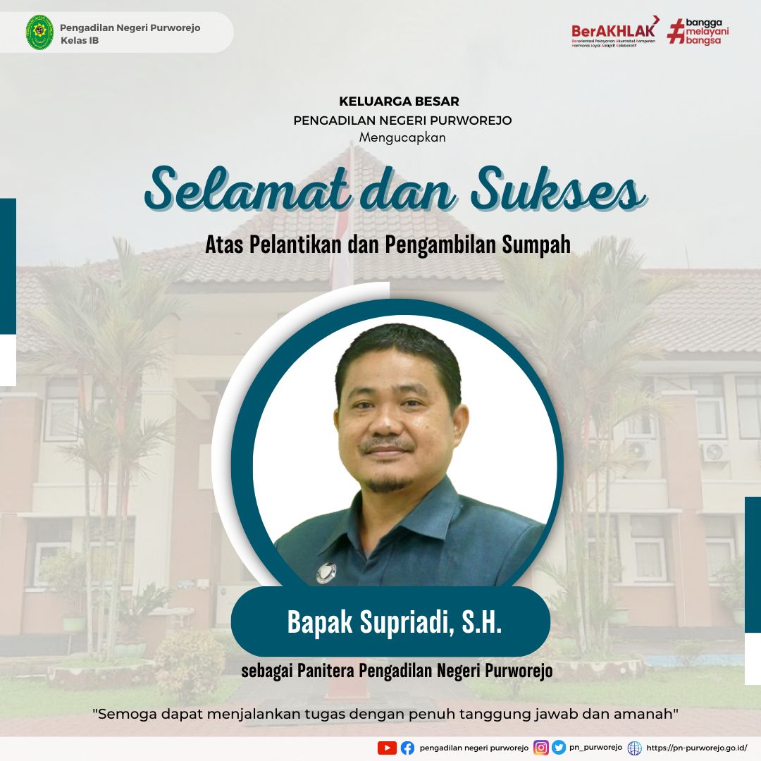 Purworejo – Selasa, 9 Januari 2024. Ketua Pengadilan Negeri Purworejo Bapak Purnomo Hadiyarto, S.H. memimpin Pelantikan dan Pengambilan Sumpah Bapak Supriadi, S.H. Sebagai Panitera Pengadilan Negeri Purworejo yang dihadiri Ketua Pengadilan Negeri Mungkid, Wakil Ketua Pengadilan Negeri Kebumen, Sekretaris Pengadilan Negeri Mungkid, para Hakim, Pejabat Struktural, Pejabat Fungsional, ASN dan PPNPN Pengadilan Negeri Purworejo yang bertempat di Aula Pengadilan Negeri Purworejo. Adapun saksi yang bertindak pada Pelantikan dan Pengambilan Sumpah Bapak Supriadi, S.H. Sebagai Panitera Pengadilan Negeri Purworejo yaitu Hakim Pengadilan Negeri Purworejo Bapak Heri Kusmanto, S.H. dan Bapak Agus Supriyono, S.H..