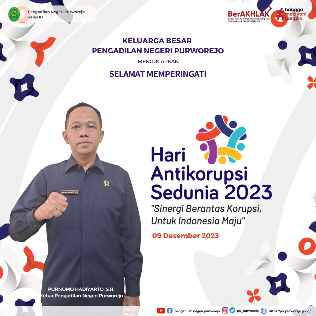 Keluarga Besar Pengadilan Negeri Purworejo mengucapkan Selamat Memperingati Hari Antikorupsi Sedunia 2023. Sinergi Berantas Korupsi untuk Indonesia Maju.