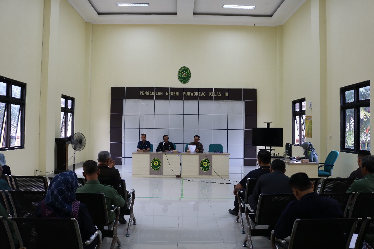 Purworejo – Rabu, 18 Oktober 2023. Bertempat di aula Pengadilan Negeri Purworejo dilaksanakan Sosialisasi Peraturan Mahkamah Agung RI Nomor 1 Tahun 2016 tentang Prosedur Mediasi di Pengadilan dan Surat Edaran Mahkamah Agung RI Nomor 1 Tahun 2023 tentang Tata Cara Panggilan dan Pemberitahuan melalui Surat Tercatat pada Satuan Kerja Pengadilan Negeri Purworejo. Kegiatan ini dipimpin langsung oleh Ketua Pengadilan Negeri Purworejo Bapak Purnomo Hadiyarto, S.H., M.H. didampingi Wakil Ketua Pengadilan Negeri Purworejo dan Panitera Pengadilan Negeri Purworejo dihadiri oleh seluruh Hakim, Panitera Muda, Panitera Pengganti dan Juru Sita.