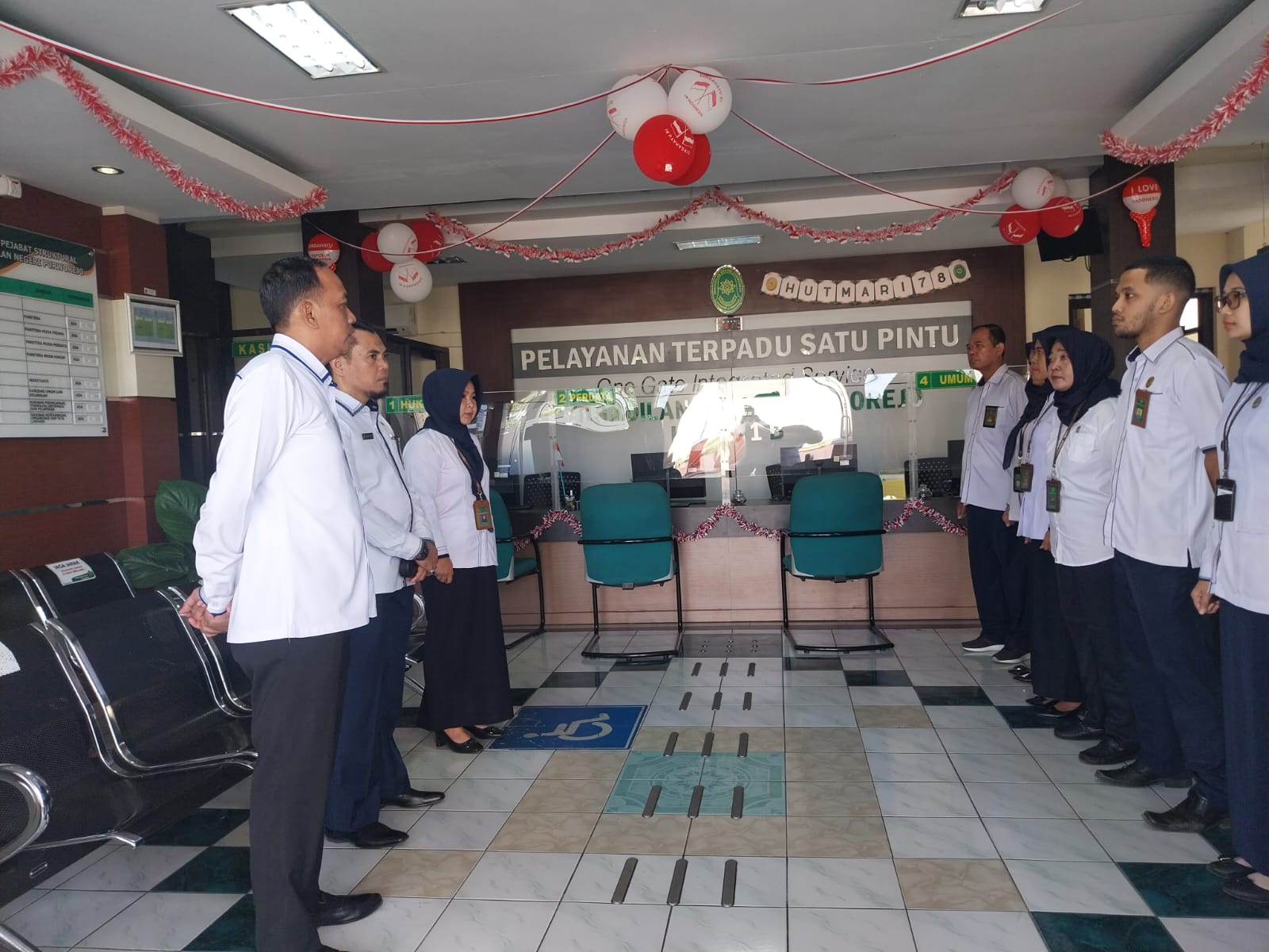 Purworejo – Senin, 14 Agustus 2023. Ketua Pengadilan Negeri Purworejo Bapak Purnomo Hadiyarto, S.H. didampingi oleh Panitera dan Sekretaris dan para pejabat struktural memberikan arahan kepada para petugas PTSP.