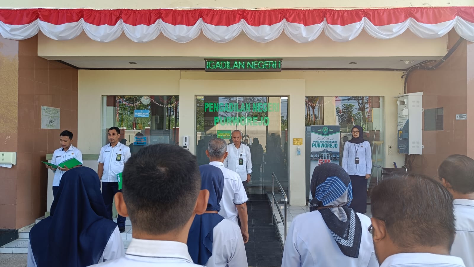 Purworejo – Senin, 14 Agustus 2023. Pengadilan Negeri Purworejo melaksanakan apel pagi yang bertempat di halaman depan Kantor Pengadilan Negeri Purworejo. Adapun pembina pada apel pagi ini adalah Hakim Pengadilan Negeri Purworejo Bapak Heri Kusmanto, S.H. serta diikuti oleh seluruh pegawai. Dan petugas pada apel pagi ini yaitu Bapak Achmad Nasichudin Imam Suprapto sebagai pemimpin apel, Bapak Ahmad Nafi'udin sebagai protokol, Bapak Ryan Aditya Wibowo, A.Md. sebagai pembaca doa dan Ibu Yuly Setyawati, A.Md sebagai pembaca yel-yel.