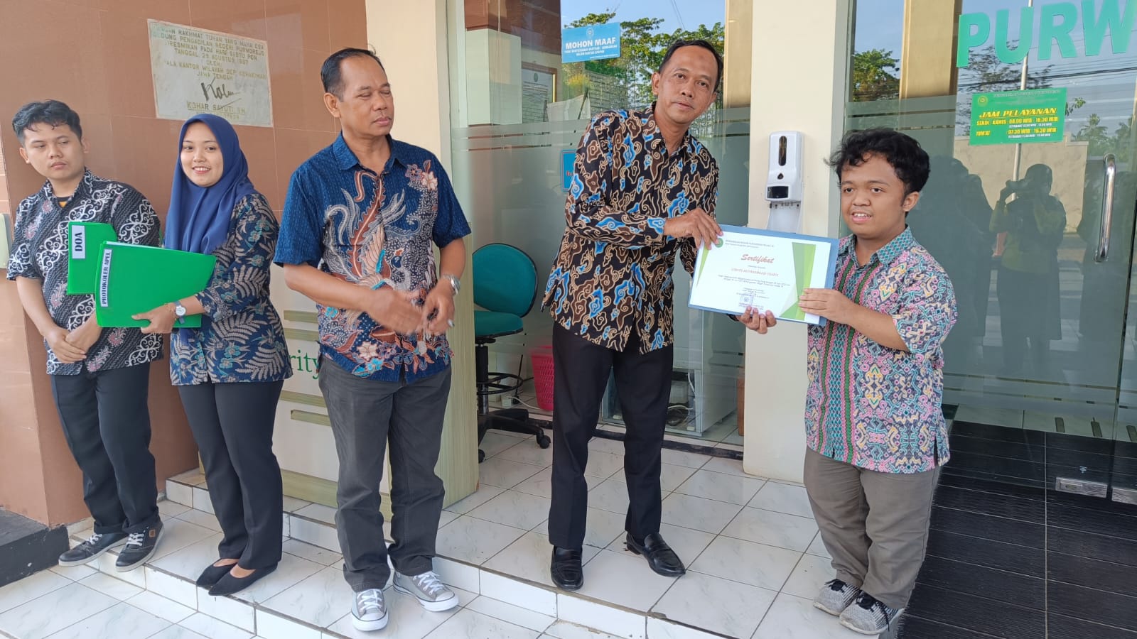 Pada apel sore ini juga diadakan pelepasan mahasiswa magang an Sdr. Ghazi Muhammad Tsany dari UIN Semarang yang telah berkahir masa magangnya di Pegadilan Negeri Purworejo. Untuk itu pada kesempatan kali ini Ketua Pengadilan Negeri Purworejo secara langsung memberikan sertifikat magang kepada an Sdr. Ghazi Muhammad Tsany dan ditutup dengan foto Bersama. Semoga ilmu dan pengalaman yang didapat di Pengadilan Negeri Purworejo bisa bermanfaat.