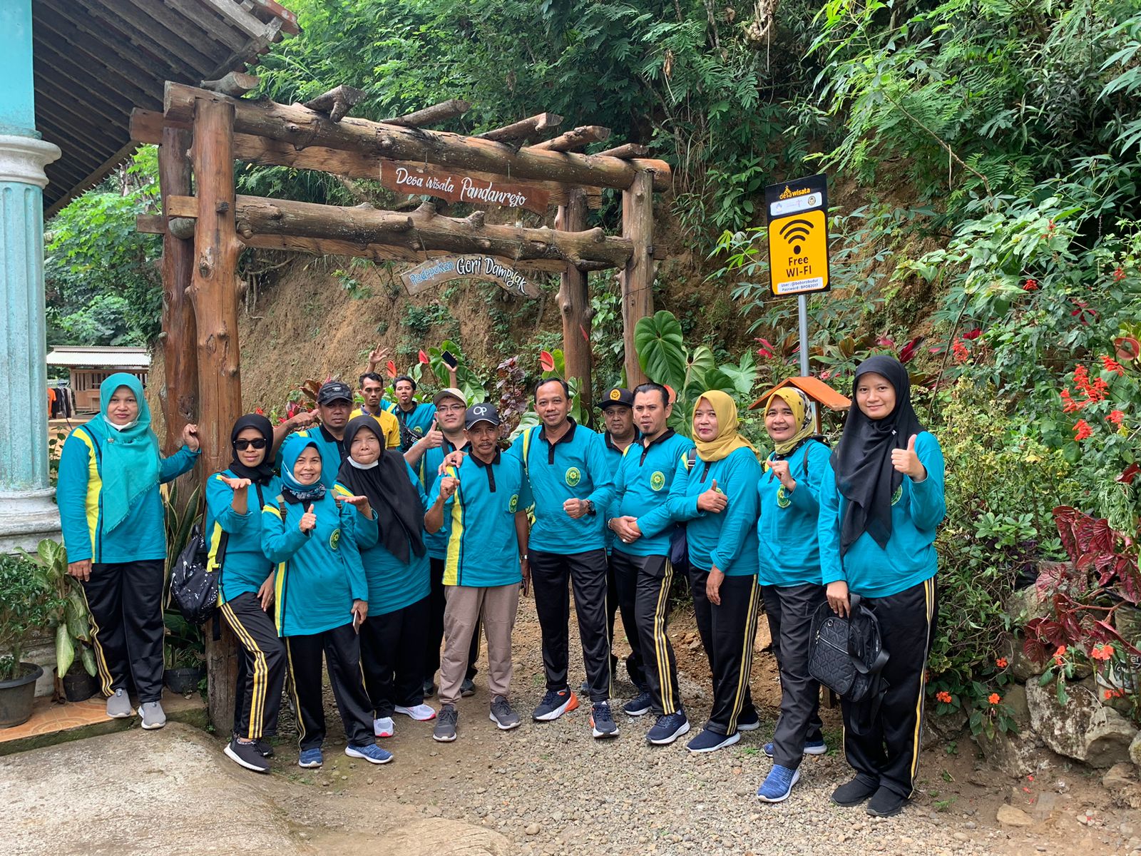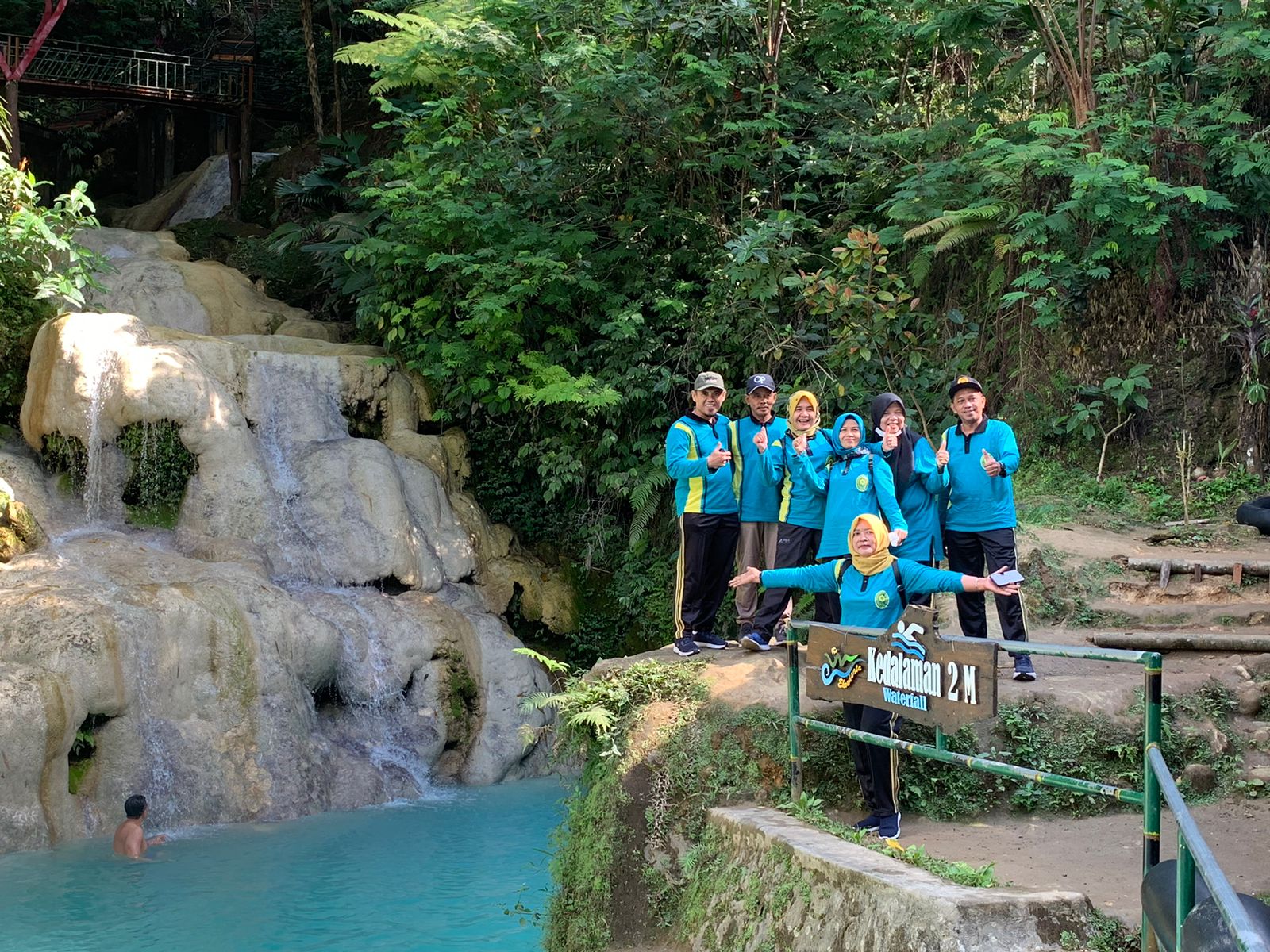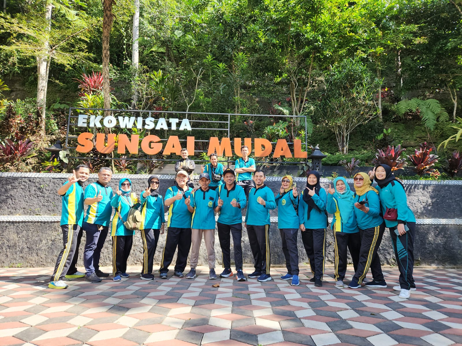 Sebelum menuju ke destinasi berikutnya rombongan berfoto Bersama di depan pintu masuk objek wisata sungai mudal.