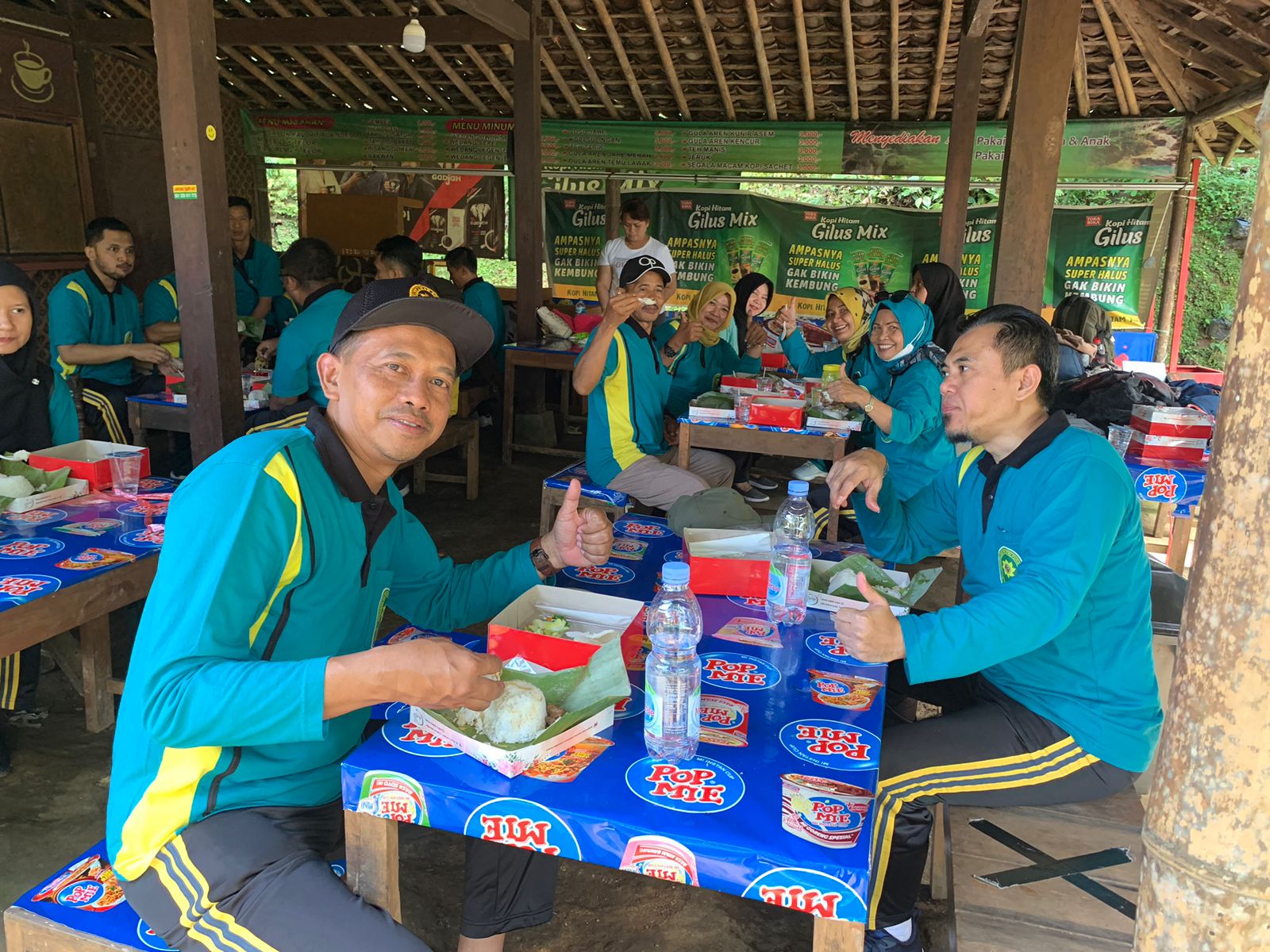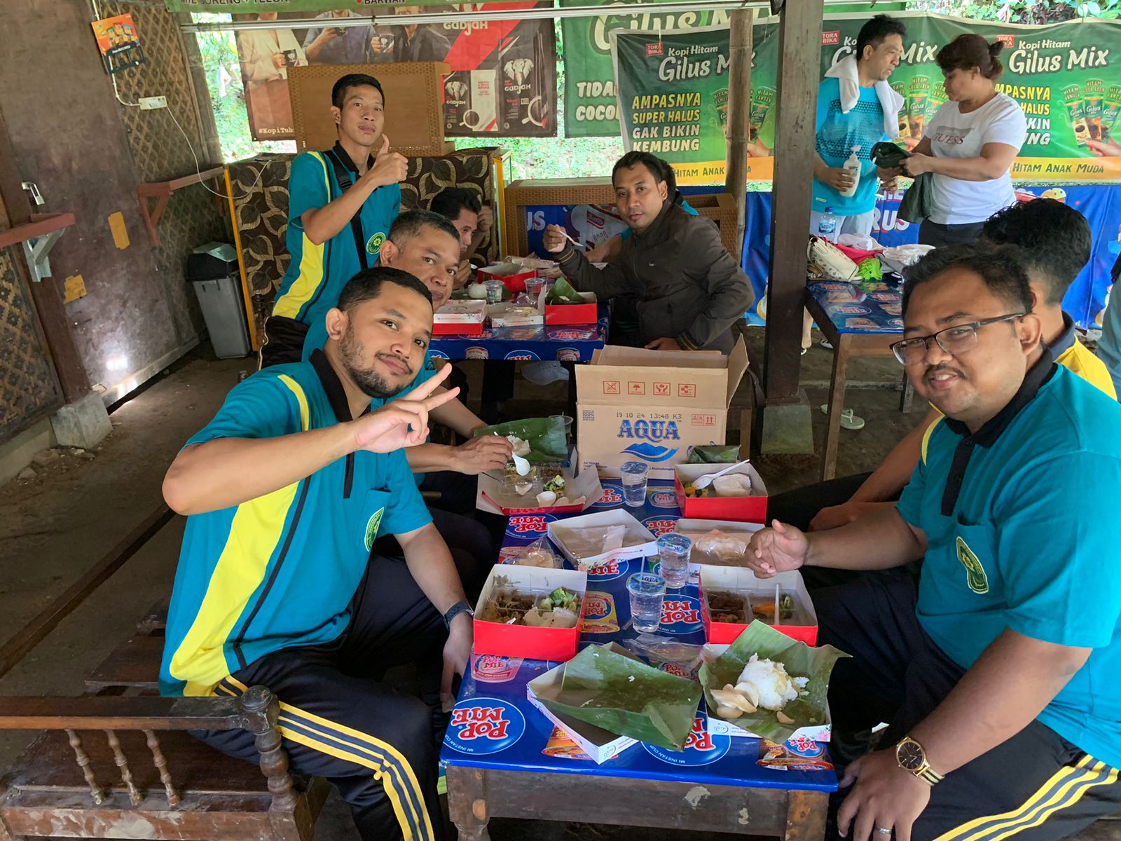 Setelah selesai menikmati indahnya objek wisata sungai mudal, rombongan makan bersama sambal beristirahat.