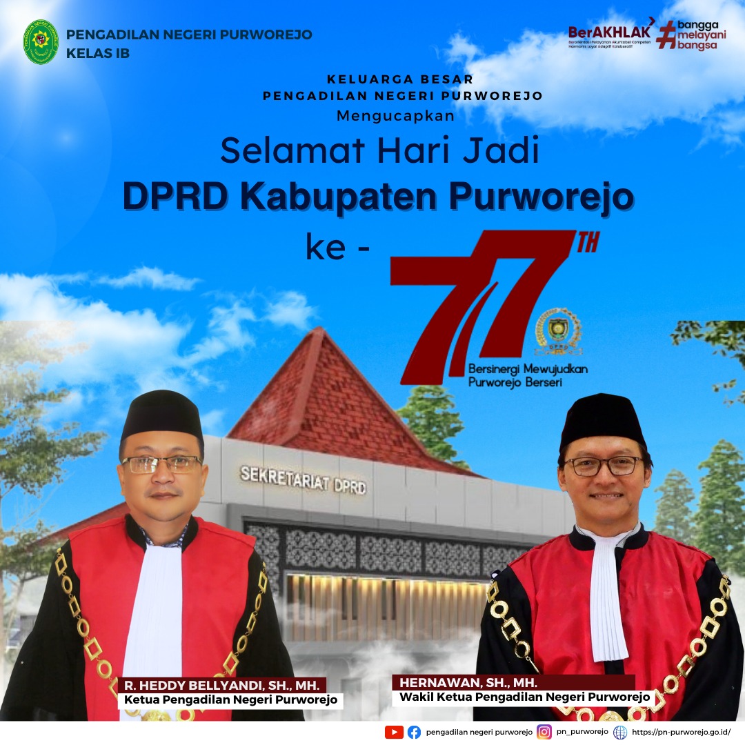 Keluarga Besar Pengadilan Negeri Purworejo mengucapkan Selamat Hari Jadi DPRD Kabupaten Purworejo ke 77 Tahun Bersinergi Mewujudkan Purworejo Berseri.
