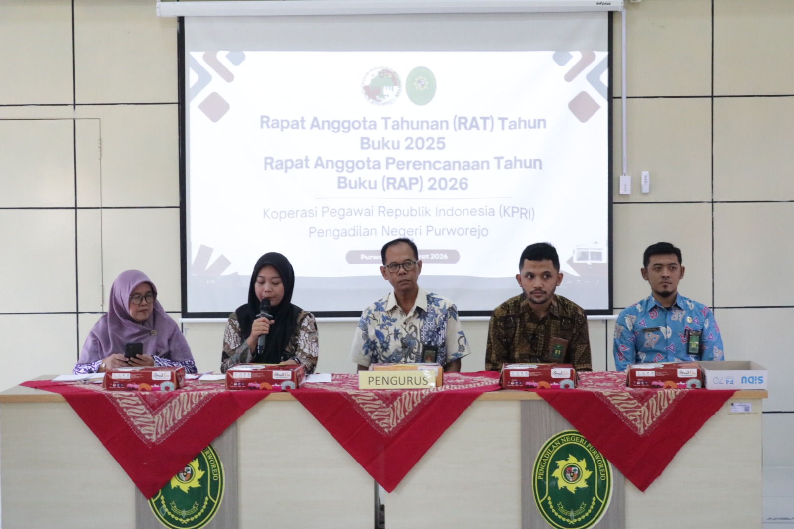 Purworejo - Jumat, 13 Maret 2026. Pengadilan Negeri Purworejo melaksanakan Rapat Anggota Tahunan (RAT) Tahun Buku 2025 Rapat Anggota Perencanaan Tahun Buku (RAP) 2026 Koperasi Pegawai Republik Indonesia (KPRI) Pengadilan Negeri Purworejo bertempat di Aula Pengadilan Negeri Purworejo yang dihadiri oleh seluruh pengurus dan anggota koperasi Pengadilan Negeri Purworejo.