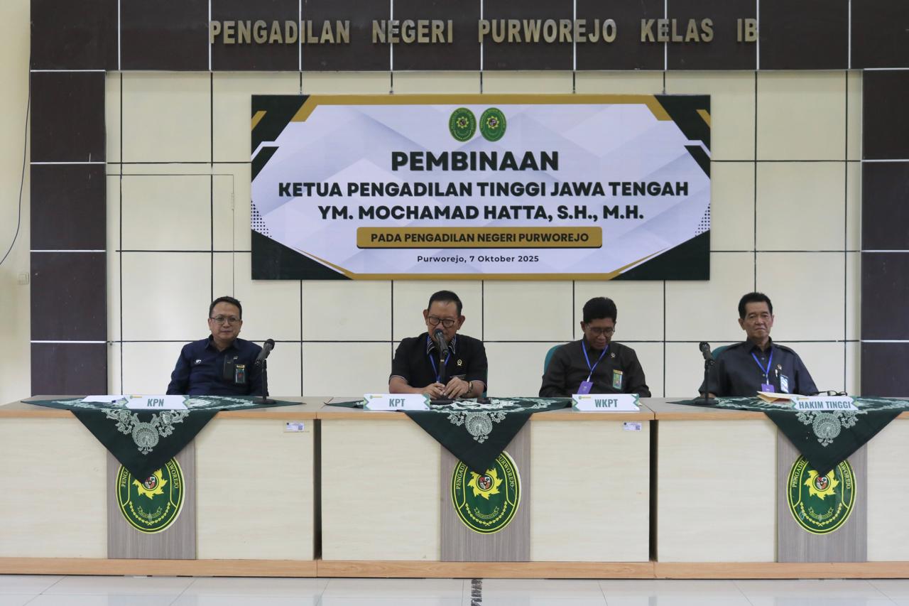 Purworejo - Selasa, 7 Oktober 2025. Ketua Pengadilan Negeri Purworejo Bapak R. Heddy Bellyandi, S.H., M.H. beserta Keluarga Besar Pengadilan Negeri Purworejo menerima kunjungan Ketua Pengadilan Tinggi Jawa Tengah Bapak H. Mochamad Hatta, S.H., M.H. didampingi Wakil Ketua Pengadilan Tinggi Jawa Tengah Bapak Aviantara, S.H., M.Hum., Hakim Tinggi Pengadilan Tinggi Jawa Tengah dan jajarannya dalam rangka pembinaan pada Pengadilan Negeri Purworejo. Pembinaan oleh Ketua Pengadilan Tinggi Jawa Tengah dilaksanakan di Aula Pengadilan Negeri Purworejo dan dihadiri seluruh Keluarga Besar Pengadilan Negeri Purworejo.