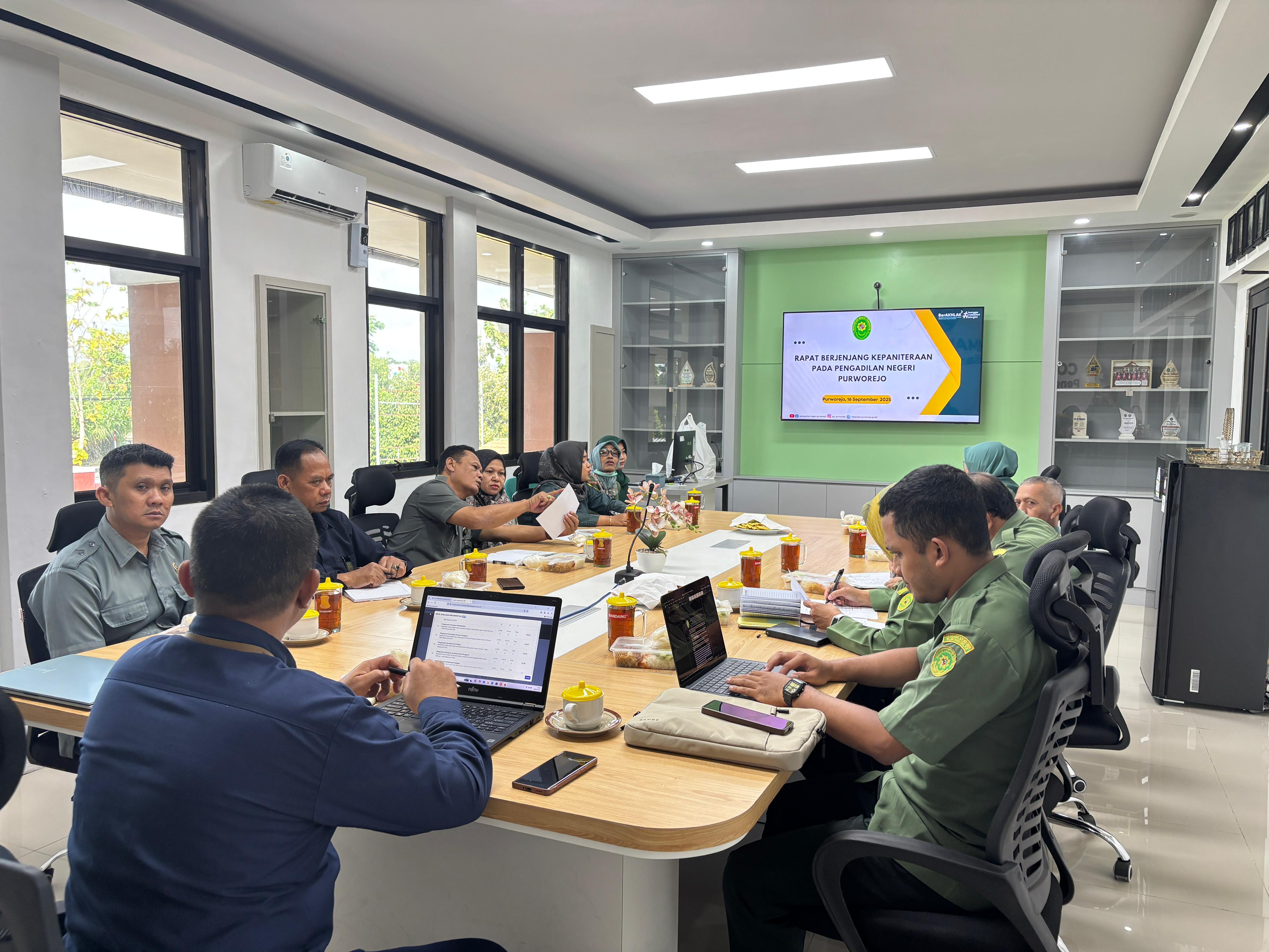 Purworejo - Selasa, 16 September 2025. Bertempat di Ruang Command Center Pengadilan Negeri Purworejo dilaksanakan Rapat Kepaniteraan yang dipimpin oleh Panitera Pengadilan Negeri Purworejo Bapak Supriadi, S.H. dan diikuti oleh seluruh Panitera Muda dan jajarannya.