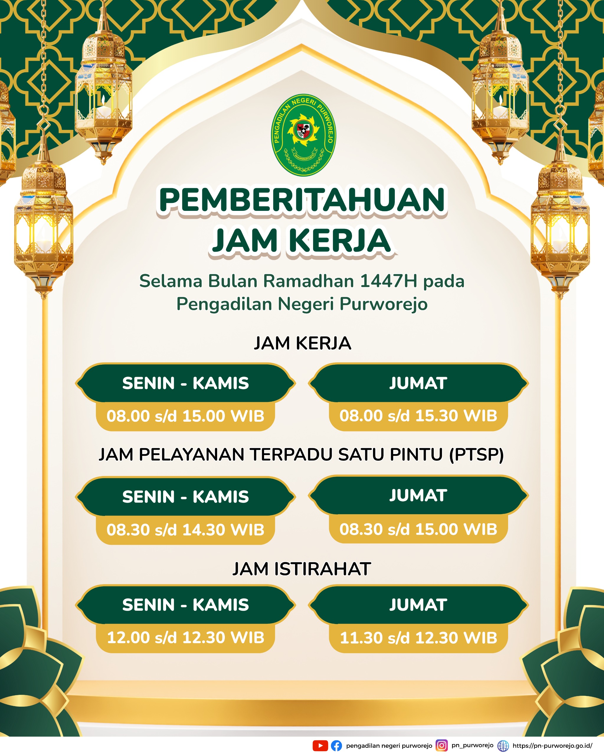 18 Februari 2026 Pengumuman Jam Kerja dan Jam Pelayanan Terpadu Satu Pintu (PTSP) Selama Bulan Ramadhan 1447 H on Rabu, 18 Februari 2026. Posted in Pengumuman Terkini Pengumuman Jam Kerja dan Jam Pelayanan Terpadu Satu Pintu (PTSP) Selama Bulan Ramadhan 1447 H / 2026 M pada Pengadilan Negeri Purworejo. Tweet