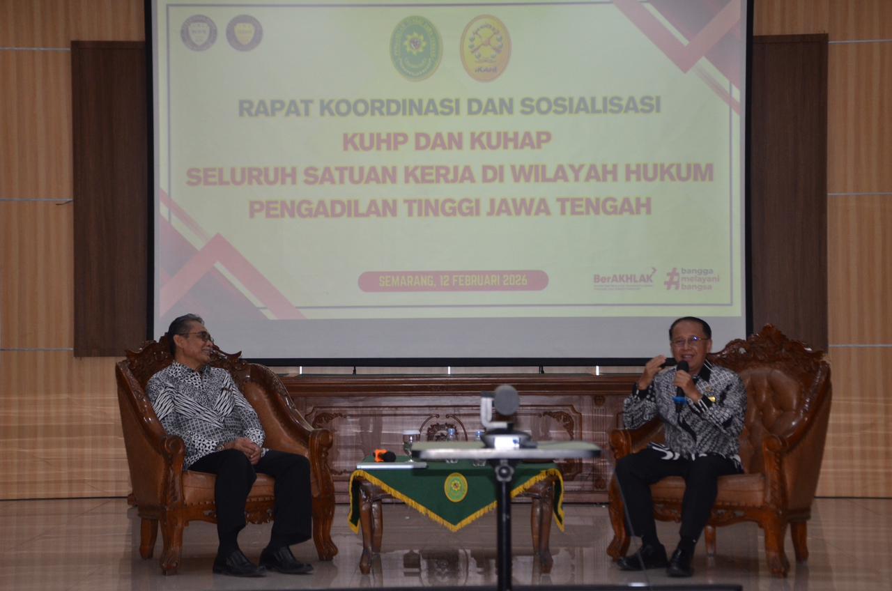 Semarang - Kamis, 12 Februari 2026. Ketua Pengadilan Negeri Purworejo Bapak Erwindu, S.H. mengikuti kegiatan Rapat Koordinasi dan Sosialisasi Undang-Undang Nomor 1 Tahun 2023 Tentang Kitab Undang-Undang Hukum Pidana (KUHP) dan Undang-Undang Nomor 20 Tahun 2025 Tentang Kitab Undang-Undang Hukum Acara Pidana (KUHAP) pada Pengadilan Tinggi Jawa Tengah.