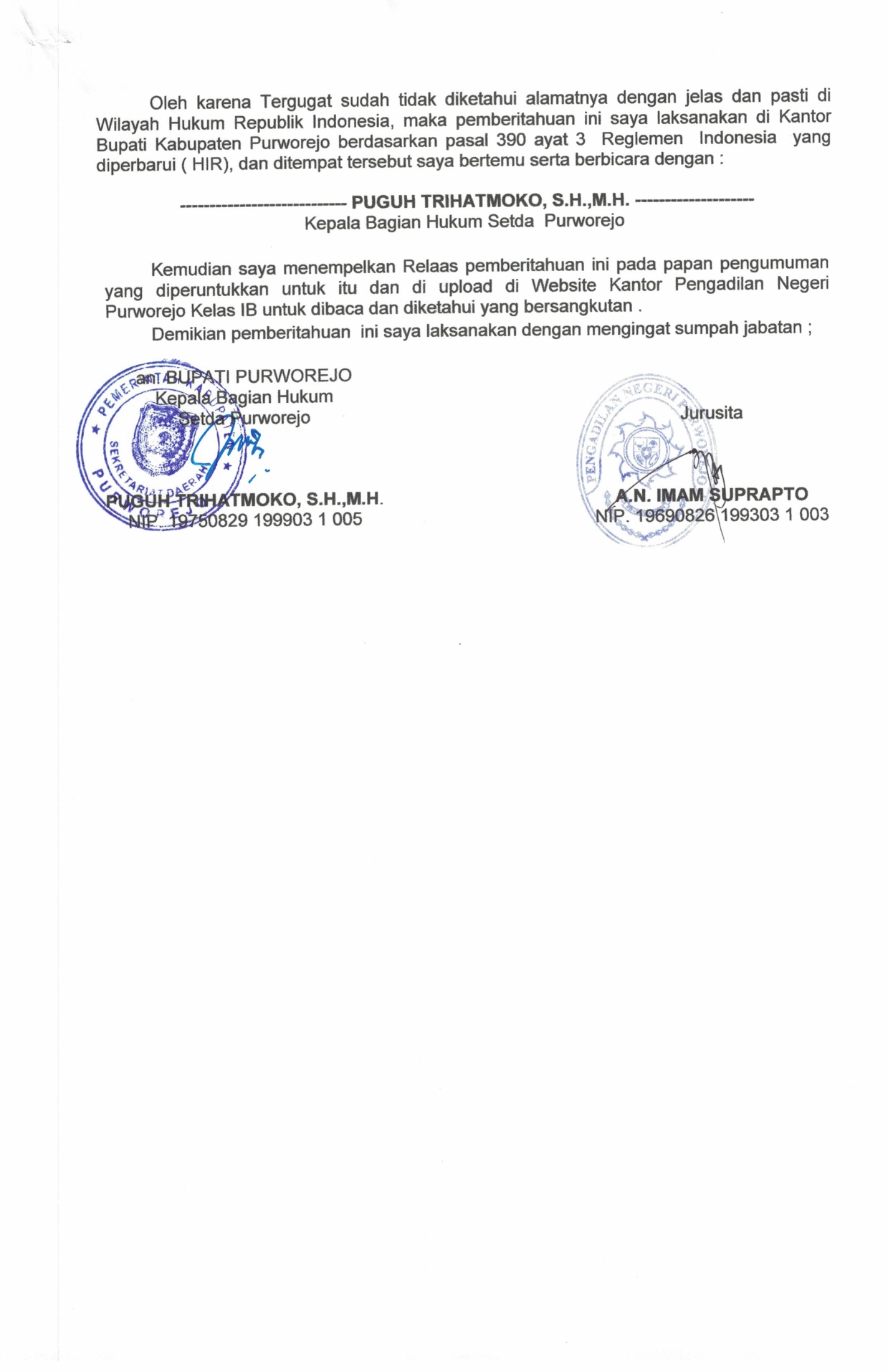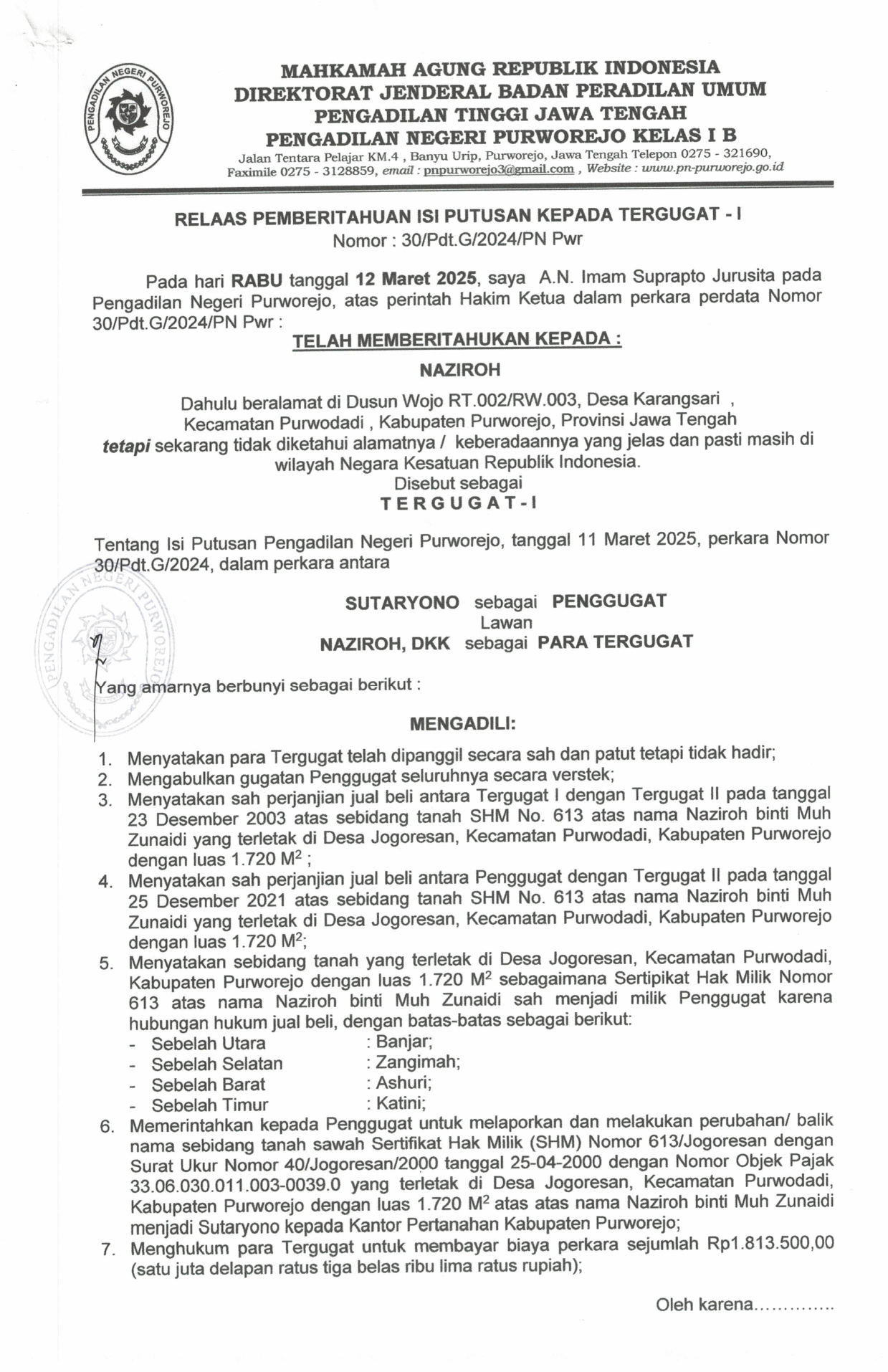 14 Maret 2025 Relaas Pemberitahuan Isi Putusan Kepada Tergugat I Nomor: 30/Pdt.G/2024/PN Pwr telah memberitahukan kepada Naziroh Dahulu tinggal di Dusun Wojo RT 002 RW 003 Desa Karangsari Kec. Purwodadi Kab Purworejo Jawa Tengah on Jumat, 14 Maret 2025. Posted in Relaas Panggilan Umum Continue Reading