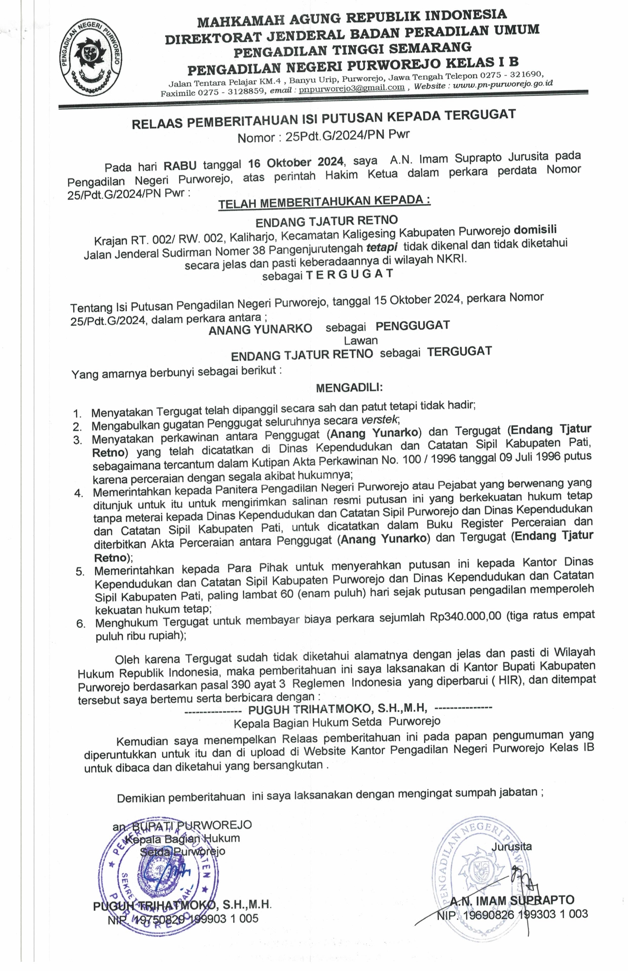 18 Oktober 2024 Relaas Panggilan Kepada Termohon Nomor 25/Pdt.G/2024/PN Pwr Telah Memanggil Endang Tjatur Retno dahulu Alamat Krajan RT 002 RW 002, Kaliharjo, Kecamatan Kaligesing, Kabupaten Purworejo domisili Jalan Jenderal Sudirman Nomor 38 Pangenjurutengah on Jumat, 18 Oktober 2024. Posted in Relaas Panggilan Umum Continue Reading