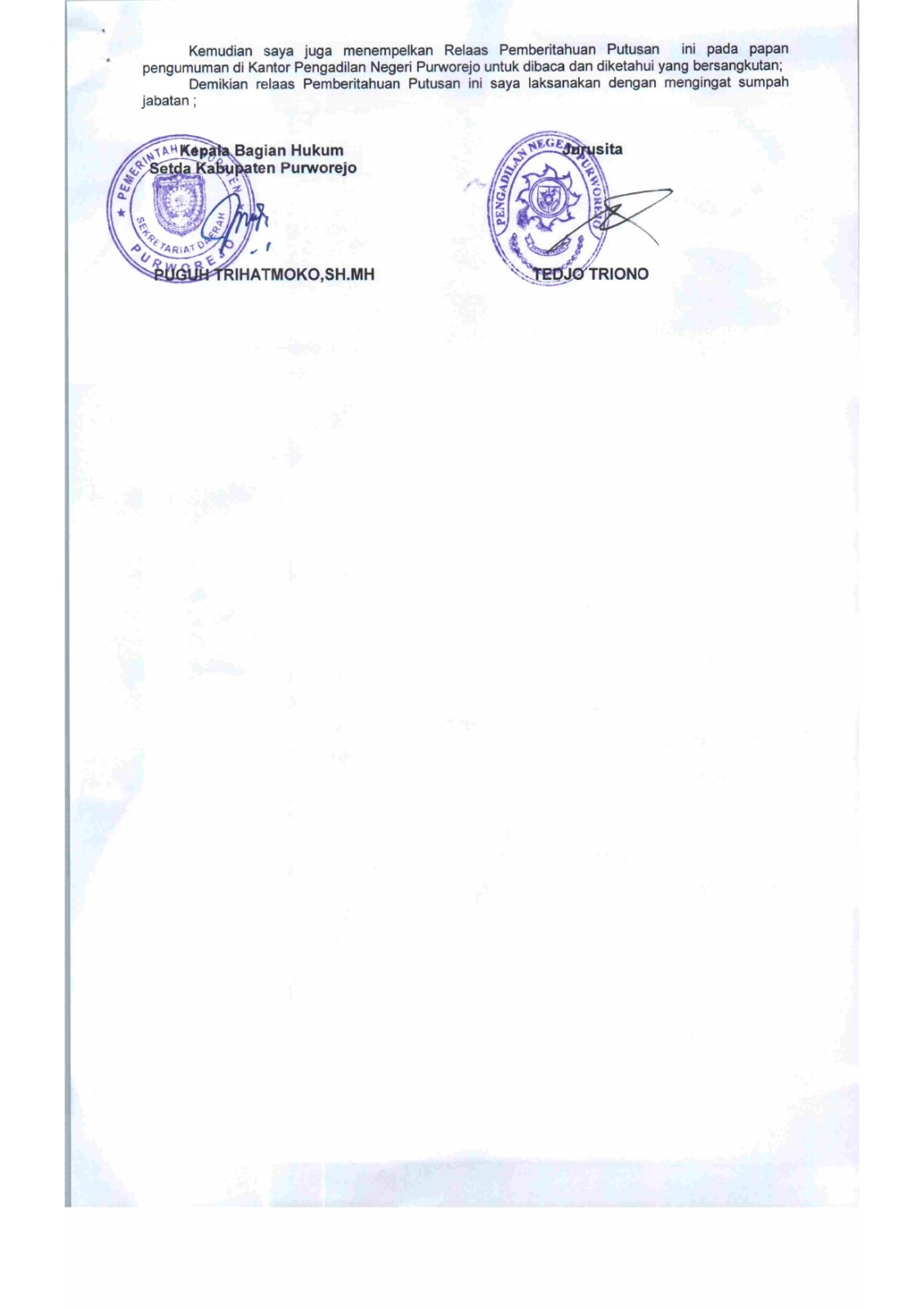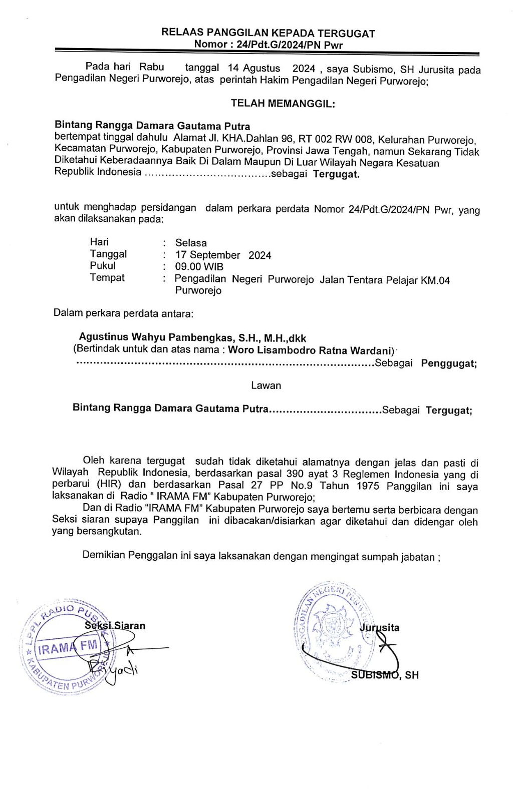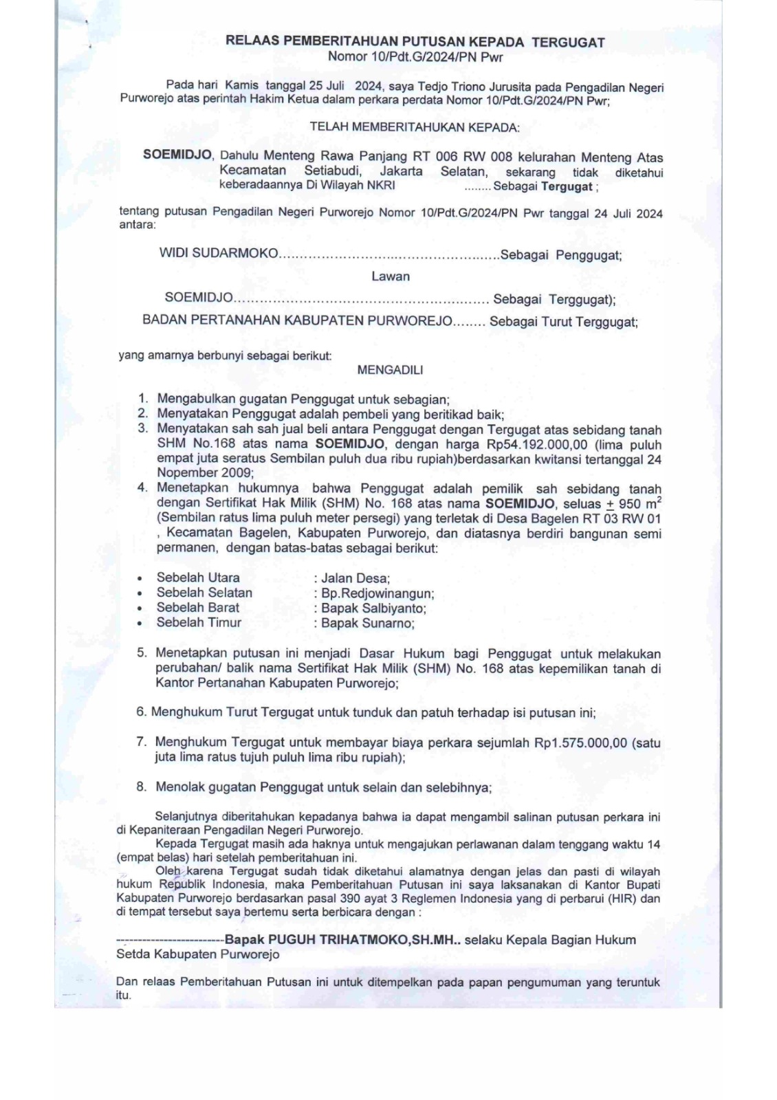 21 Agustus 2024 Relaas Panggilan Kepada Tergugat I Nomor: 24/Pdt.G/2024/PN Pwr telah memanggil Bintang Rangga Damara Gautama Putra bertempat tinggal dahulu Alamat JL. KHA Dahlan 96 RT 002 RW 008, Kel. Purworejo, Kec. Purworejo, Kab. Purworejo on Rabu, 21 Agustus 2024. Posted in Relaas Panggilan Umum Continue Reading