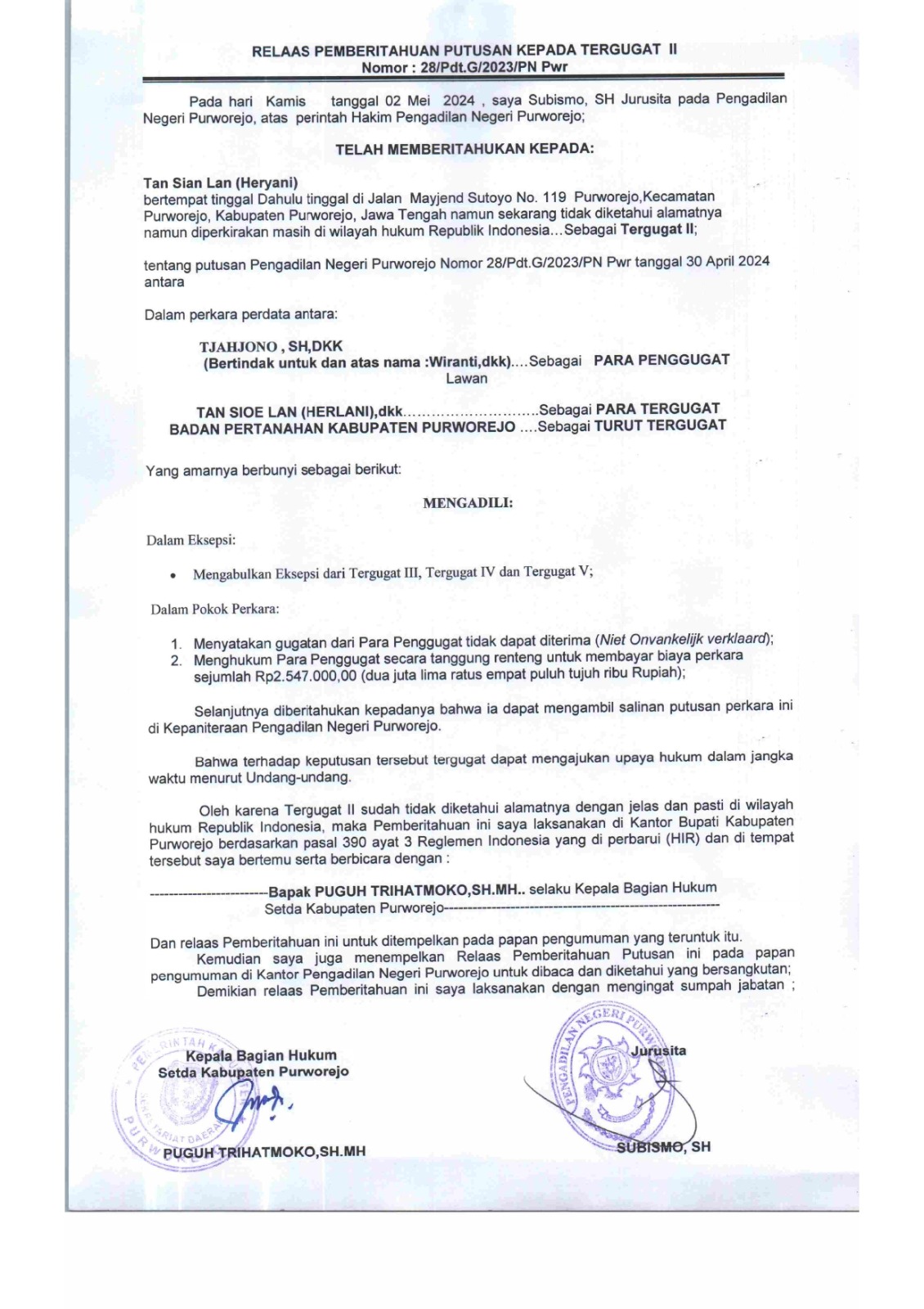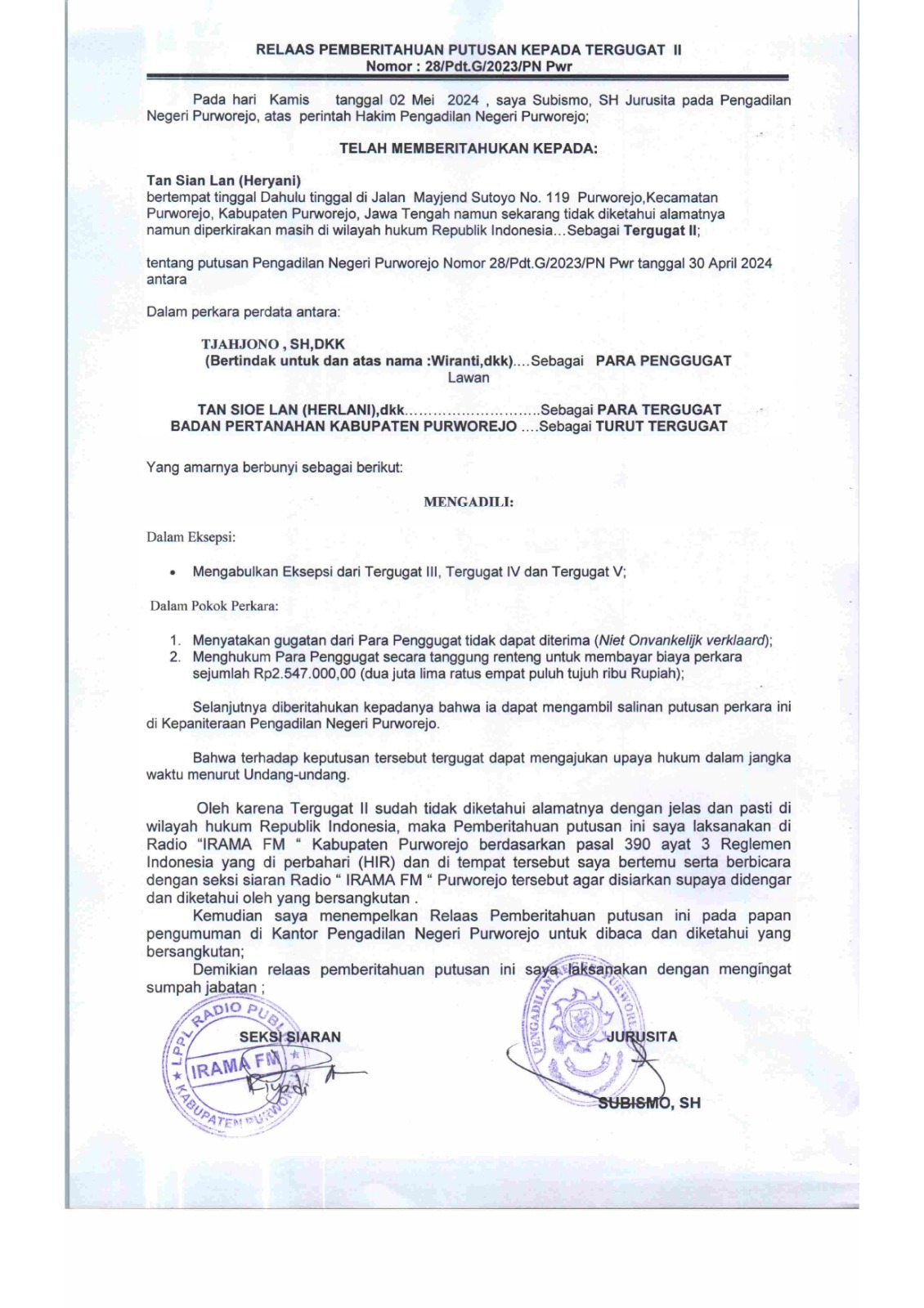 07 Mei 2024 Relaas Panggilan Kepada Tergugat Nomor II 28/Pdt.G/2023/PN Pwr telah memberitahukan kepada Tan Sian Lan (Heryani) bertempat tinggal alamat dahulu di Jalan Mayjend Sutoyo No. 119 Purworejo Kecamatan Purworejo, Kabupaten Purworejo. on Selasa, 07 Mei 2024. Posted in Relaas Panggilan Umum Continue Reading