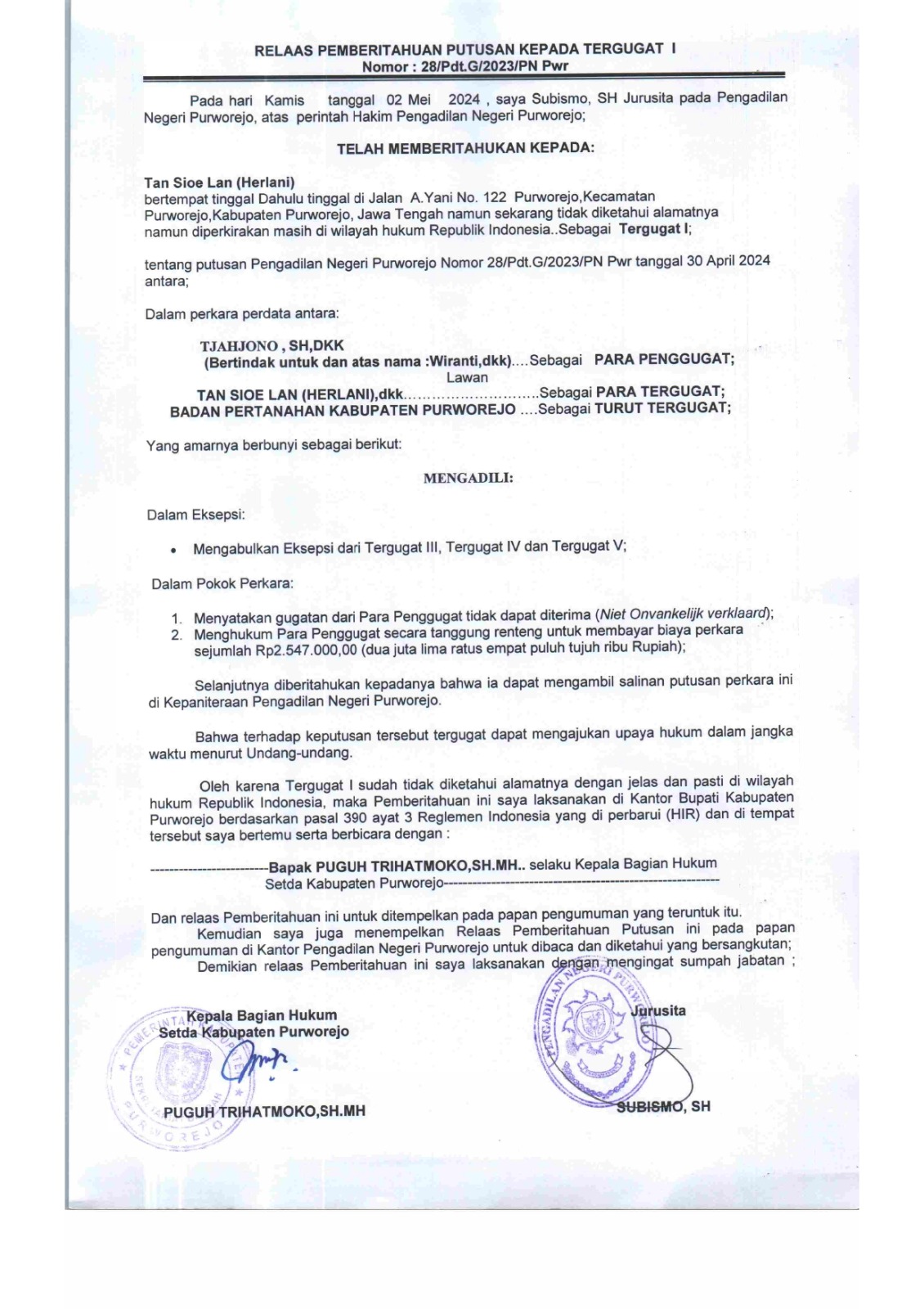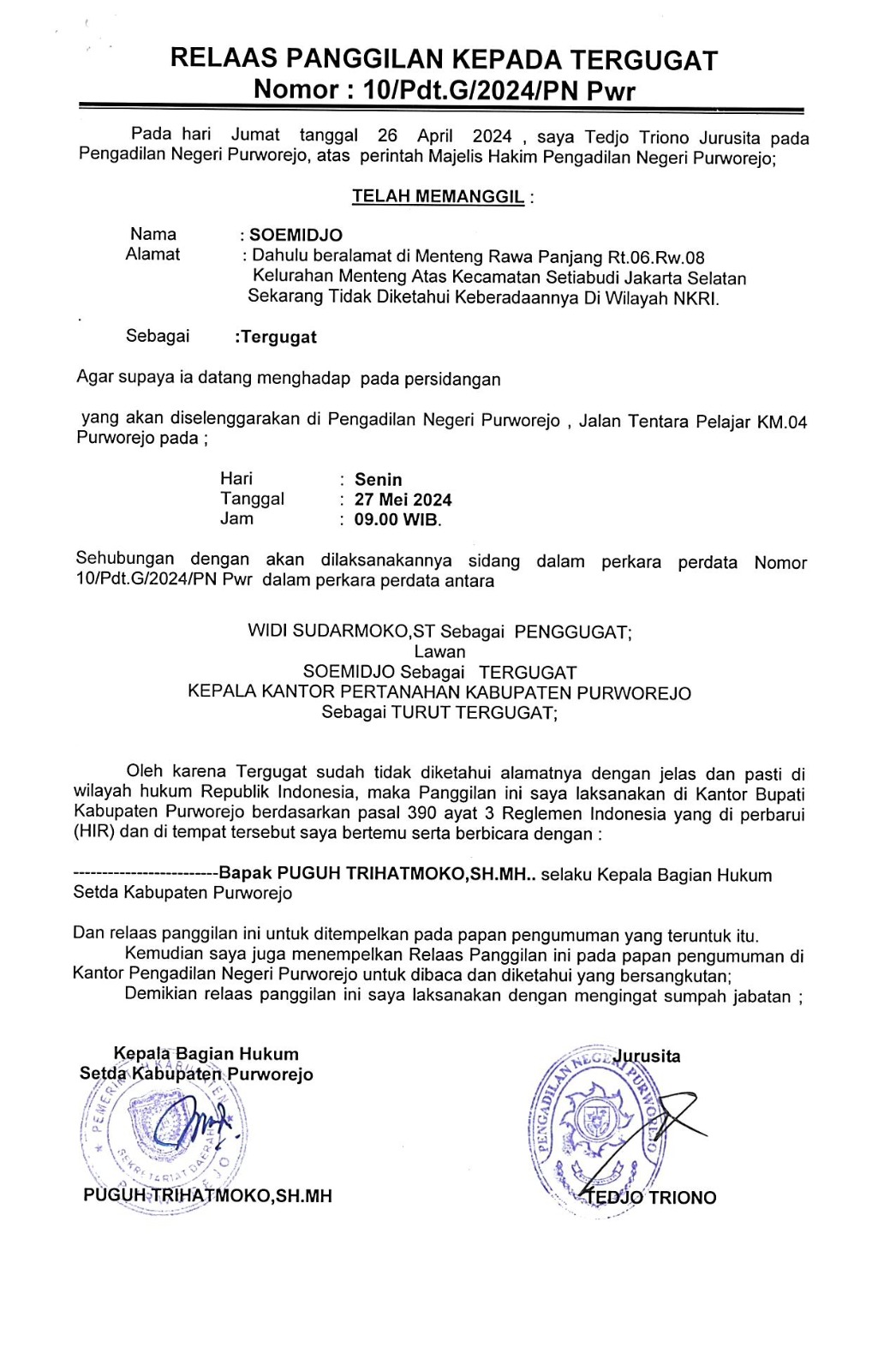 30 April 2024 Relaas Panggilan Kepada Tergugat Nomor 10/Pdt.G/2024/PN Pwr telah memberitahukan kepada Soemidjo bertempat tinggal alamat dahulu di Menteng Rawa Panjang RT 06 RW 08 Kelurahan Menteng Atas Kecematan Setiabudi Jakarta Selatan on Selasa, 30 April 2024. Posted in Relaas Panggilan Umum Continue Reading