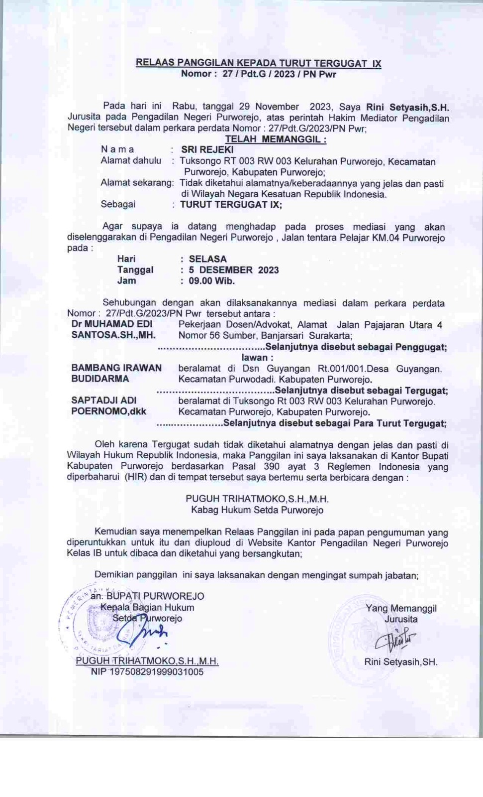 04 Desember 2023 Relaas Panggilan Kepada Turut Tergugat IX Nomor 27/Pdt.G/2023/PN Pwr an Sri Rejeki Alamat Dahulu Tuksongo RT 003 RW 003 Kelurahan Purworejo, Kecamatan Purworejo, Kabupaten Purworejo on Senin, 04 Desember 2023. Posted in Relaas Panggilan Umum Continue Reading