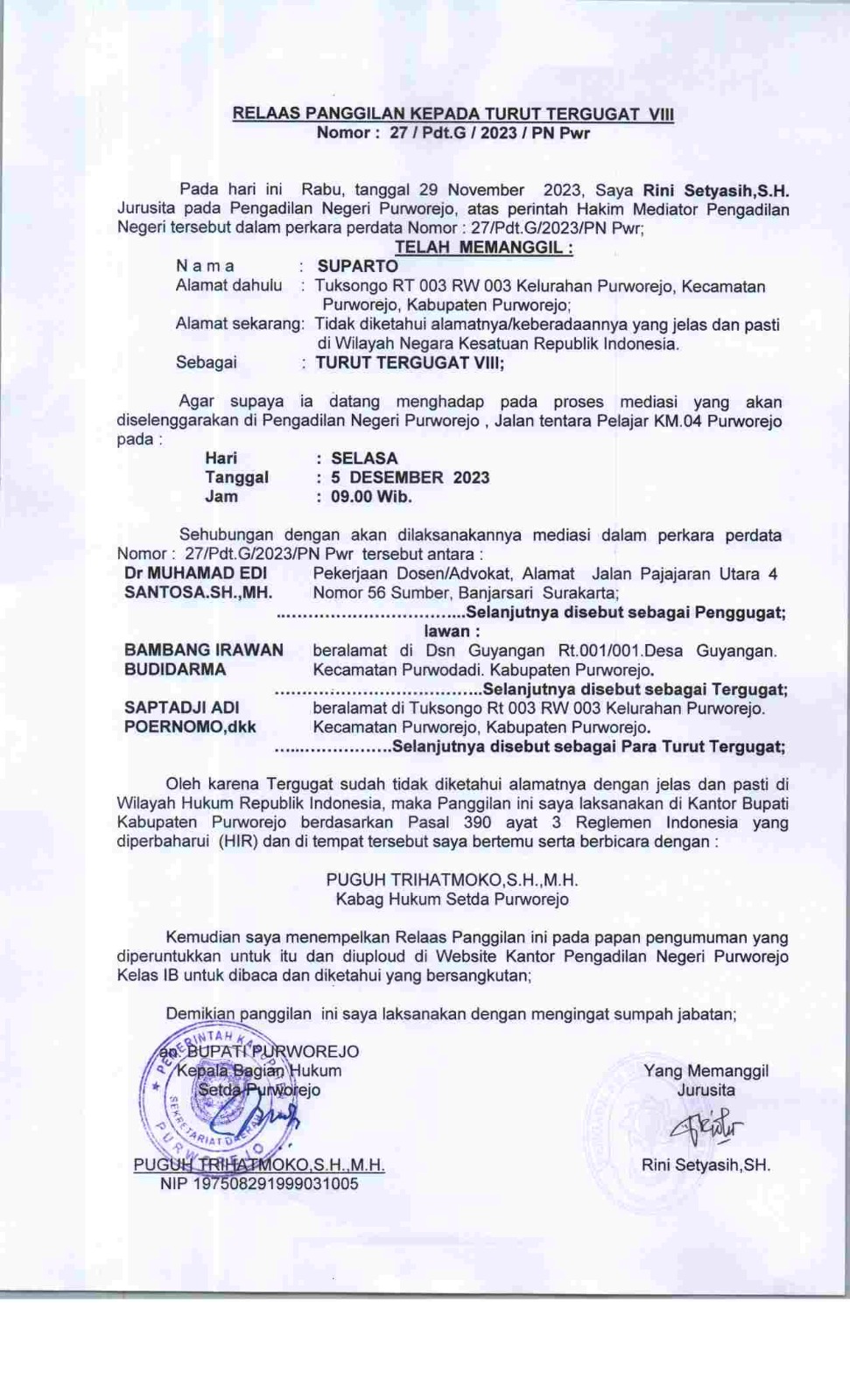 04 Desember 2023 Relaas Panggilan Kepada Turut Tergugat VIII Nomor 27/Pdt.G/2023/PN Pwr an Suparto Alamat Dahulu Tuksongo RT 003 RW 003 Kelurahan Purworejo, Kecamatan Purworejo, Kabupaten Purworejo on Senin, 04 Desember 2023. Posted in Relaas Panggilan Umum Continue Reading
