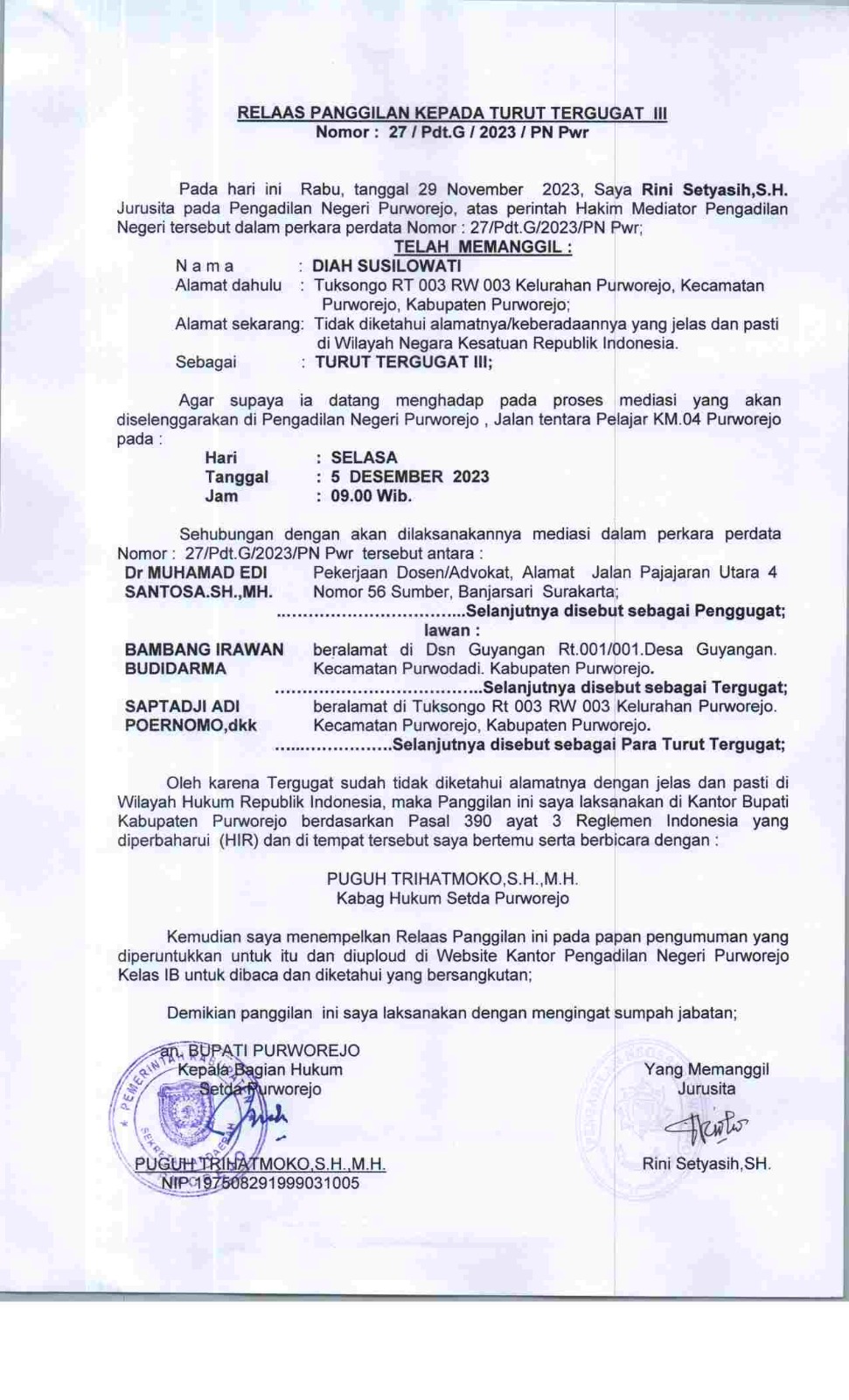 04 Desember 2023 Relaas Panggilan Kepada Turut Tergugat III Nomor 27/Pdt.G/2023/PN Pwr an Diah Susilowati Alamat Dahulu Tuksongo RT 003 RW 003 Kelurahan Purworejo, Kecamatan Purworejo, Kabupaten Purworejo on Senin, 04 Desember 2023. Posted in Relaas Panggilan Umum Continue Reading