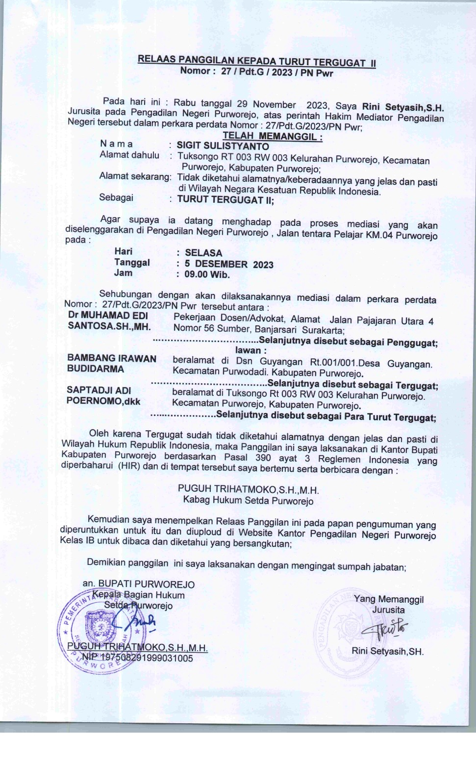 04 Desember 2023 Relaas Panggilan Kepada Turut Tergugat II Nomor 27/Pdt.G/2023/PN Pwr an Sigit Sulistyanto Alamat Dahulu Tuksongo RT 003 RW 003 Kelurahan Purworejo, Kecamatan Purworejo, Kabupaten Purworejo on Senin, 04 Desember 2023. Posted in Relaas Panggilan Umum Continue Reading