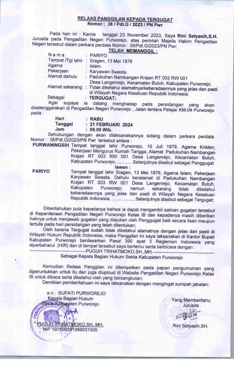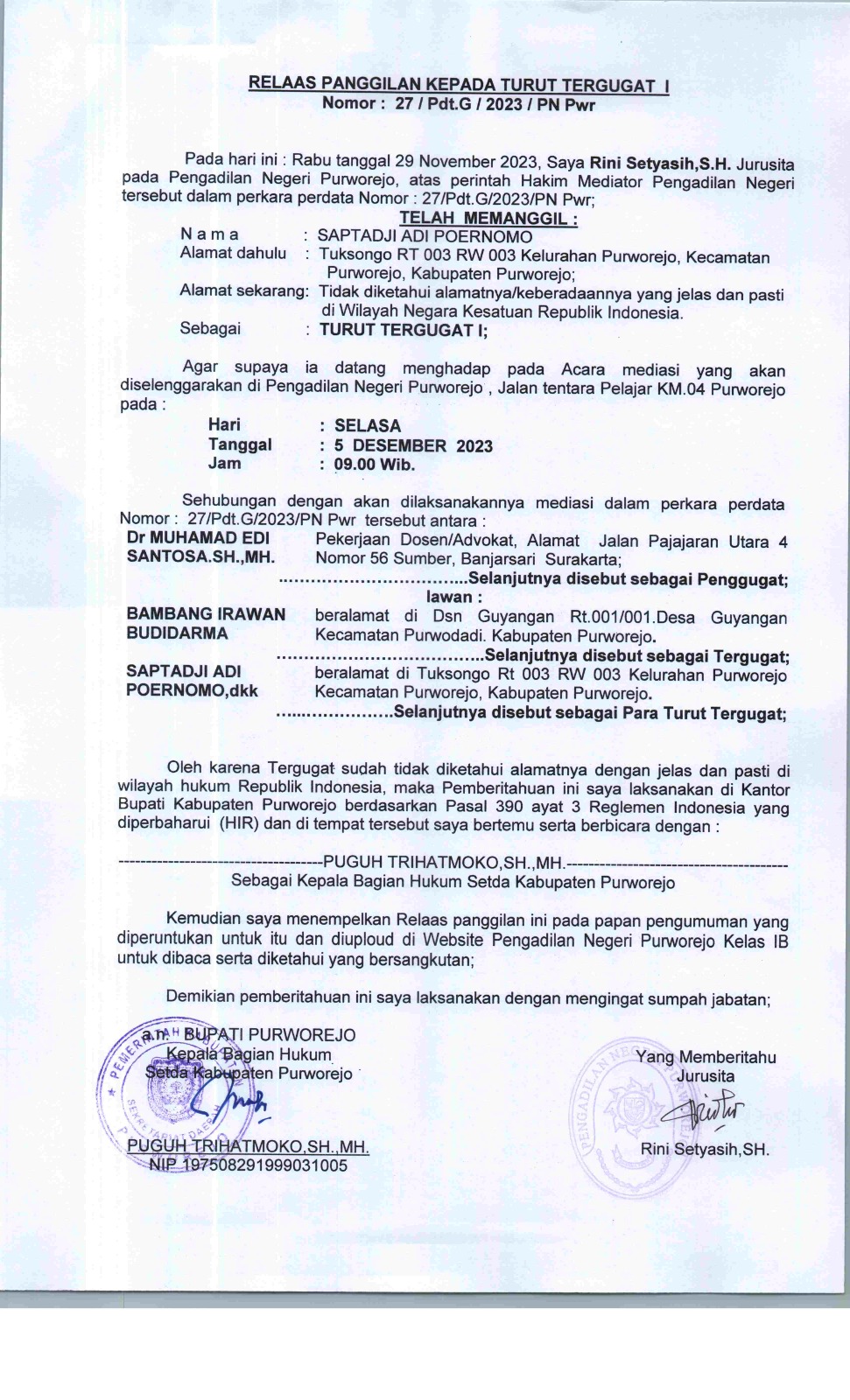 04 Desember 2023 Relaas Panggilan Kepada Turut Tergugat I Nomor 27/Pdt.G/2023/PN Pwr an Saptadji Adi Poernomo Alamat Dahulu Tuksongo RT 003 RW 003 Kelurahan Purworejo, Kecamatan Purworejo, Kabupaten Purworejo on Senin, 04 Desember 2023. Posted in Relaas Panggilan Umum Continue Reading