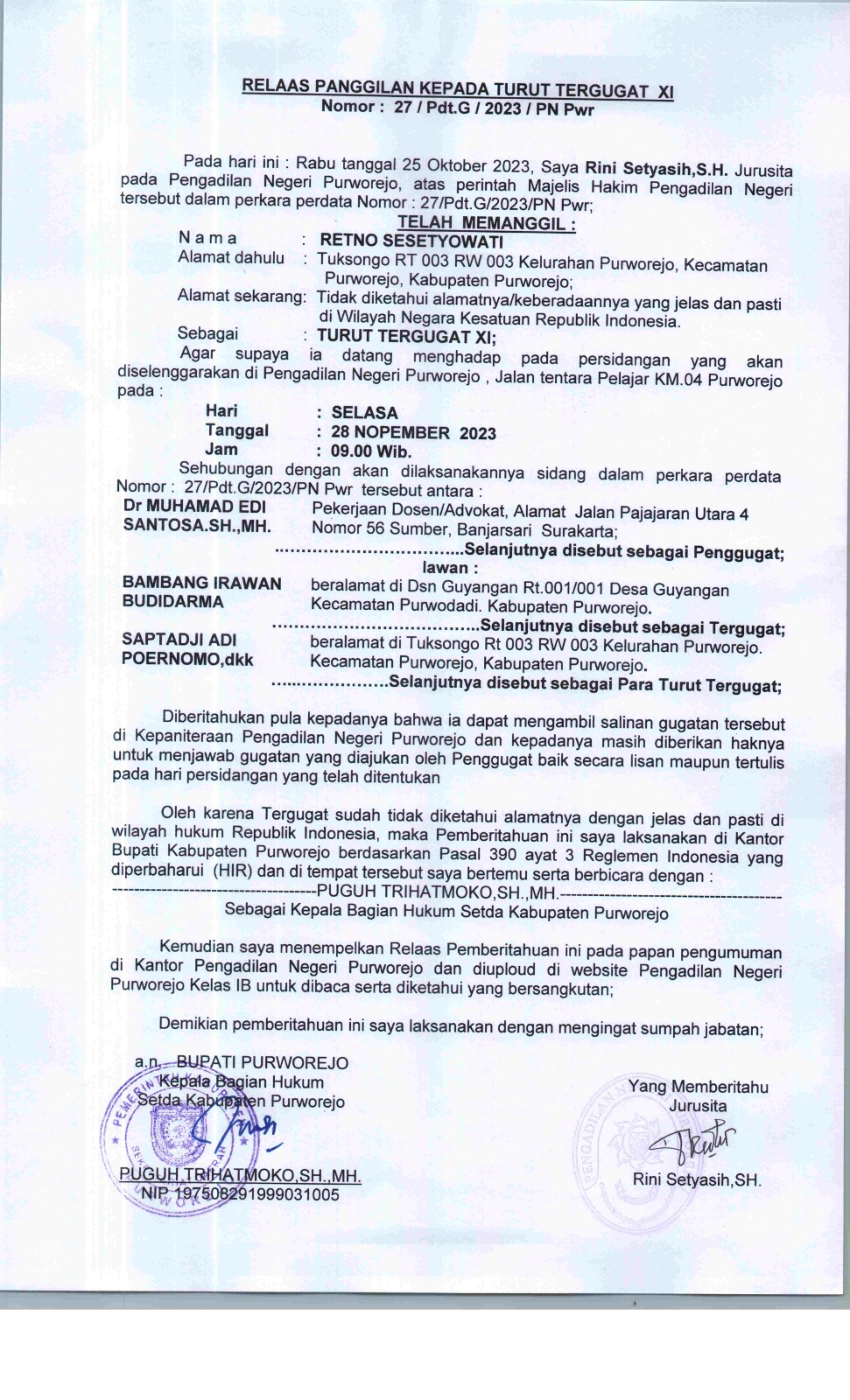 02 November 2023 Relaas Panggilan Kepada Turut Tergugat XI Nomor 27/Pdt.G/2023/PN Pwr an Retno Sesetyowati Alamat Dahulu Tuksongo RT 003 RW 003 Kelurahan Purworejo, Kecamatan Purworejo, Kabupaten Purworejo on Kamis, 02 November 2023. Posted in Relaas Panggilan Umum Continue Reading