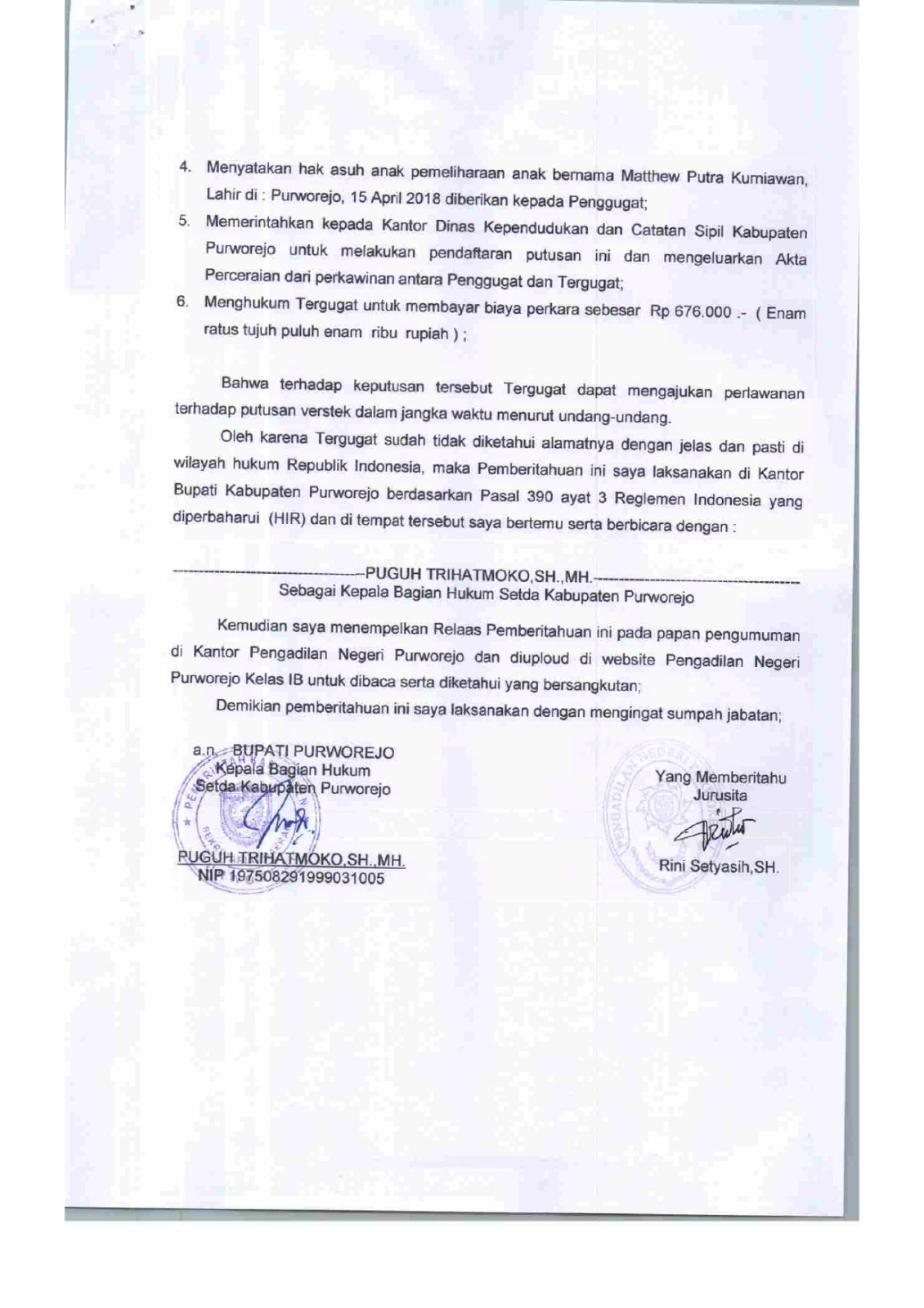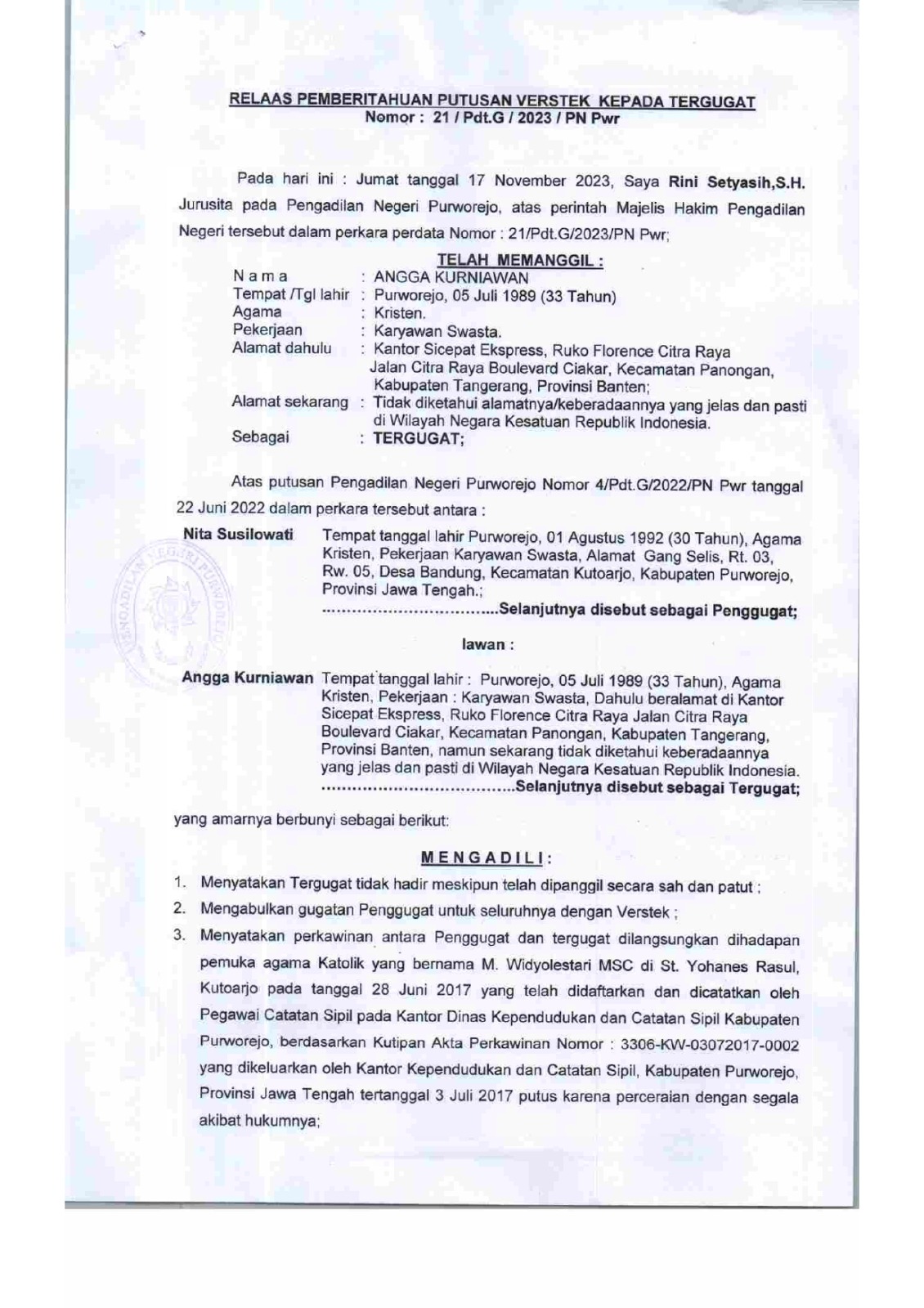 29 November 2023 Relaas Pemberitahuan Putusan Verstek Kepada Tergugat Nomor : 21/Pdt.G/2023/PN Pwr an Angga Kurniawan on Rabu, 29 November 2023. Posted in Relaas Panggilan Umum Continue Reading