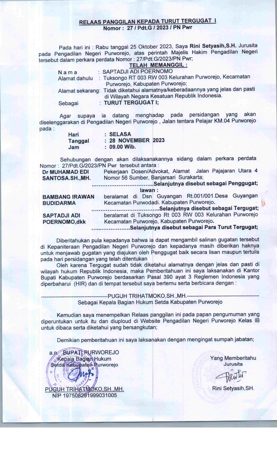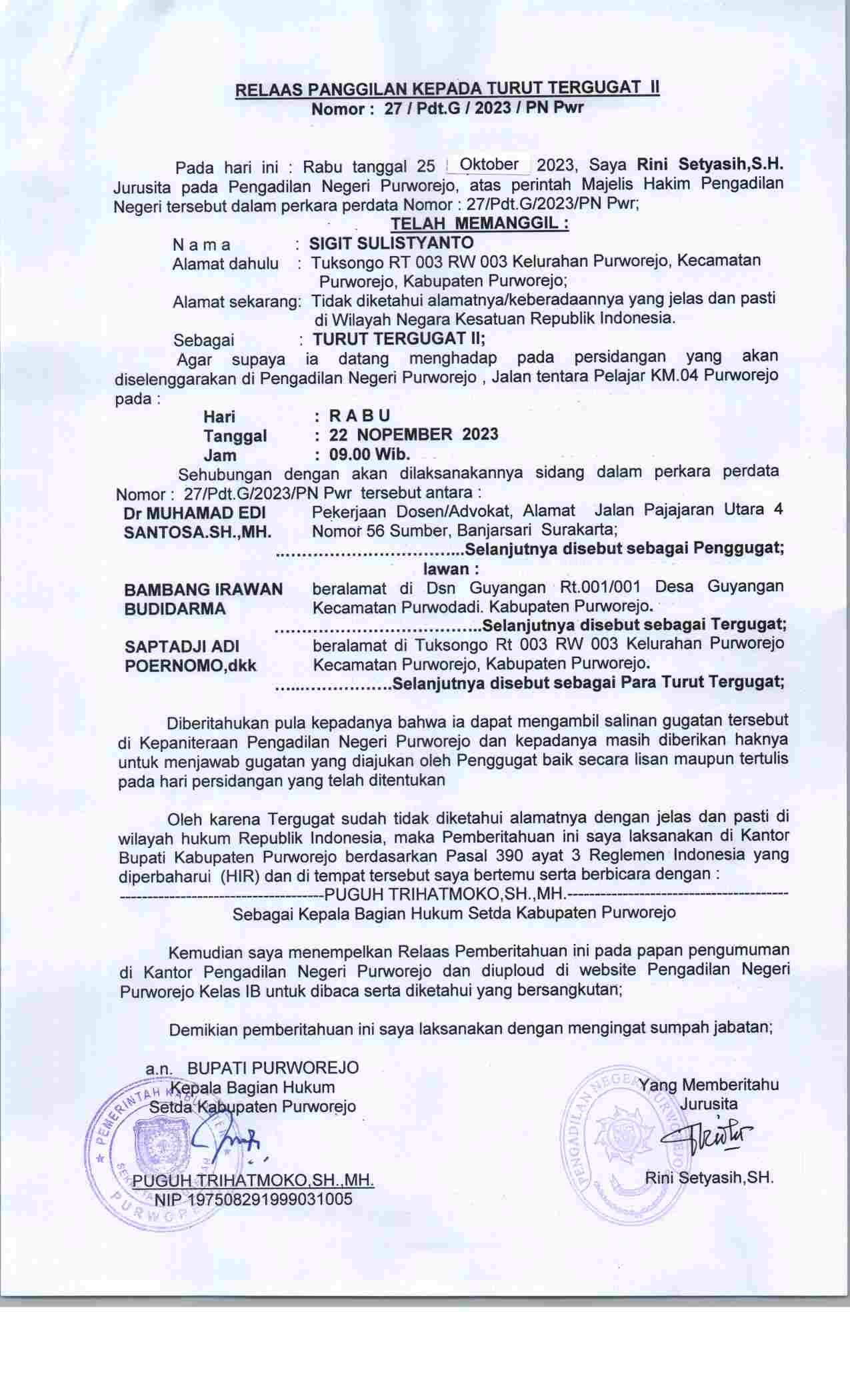 02 November 2023 Relaas Panggilan Kepada Turut Tergugat II Nomor 27/Pdt.G/2023/PN Pwr an Sigit Sulistyanto Alamat Dahulu Tuksongo RT 003 RW 003 Kelurahan Purworejo, Kecamatan Purworejo, Kabupaten Purworejo on Kamis, 02 November 2023. Posted in Relaas Panggilan Umum Continue Reading
