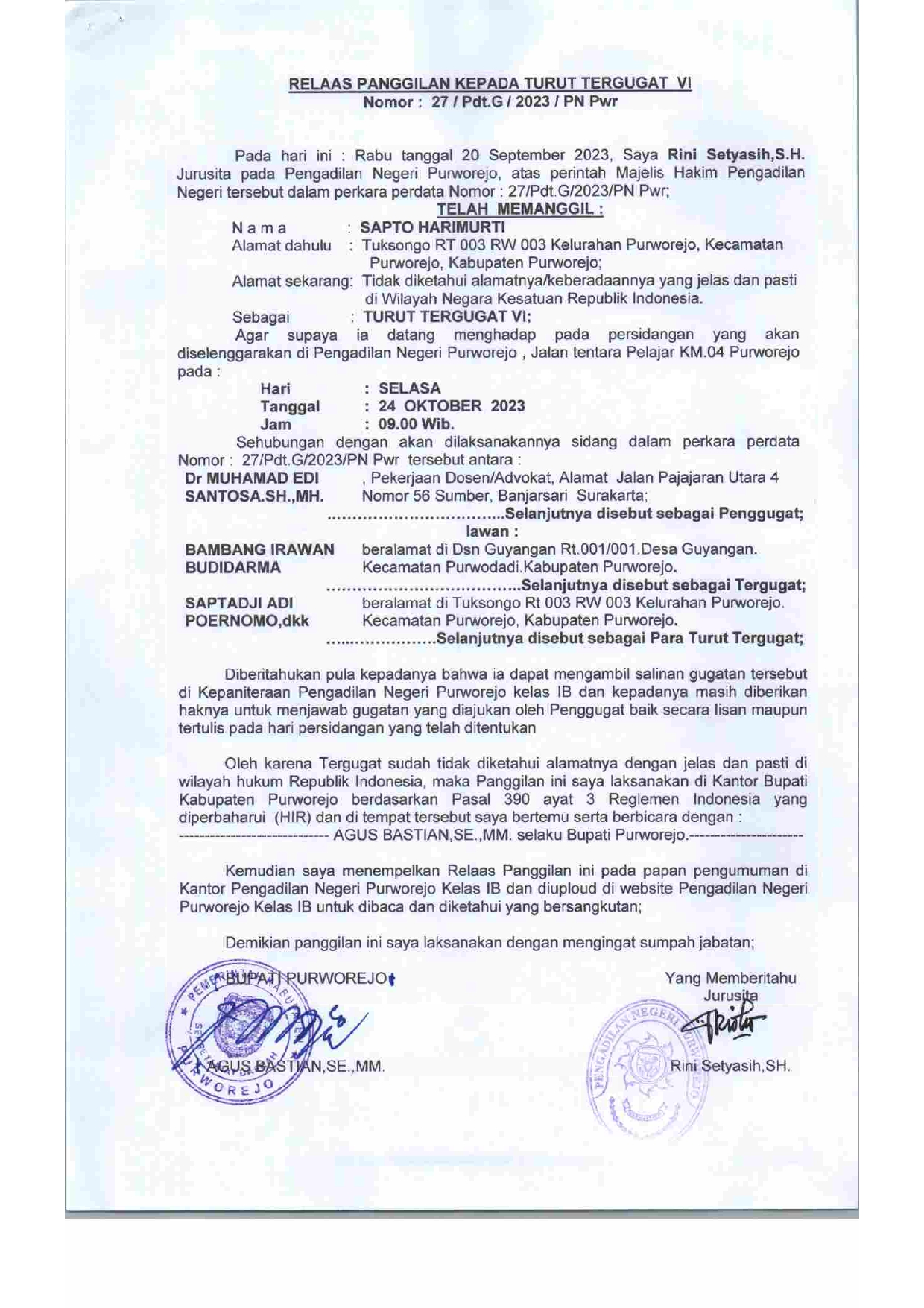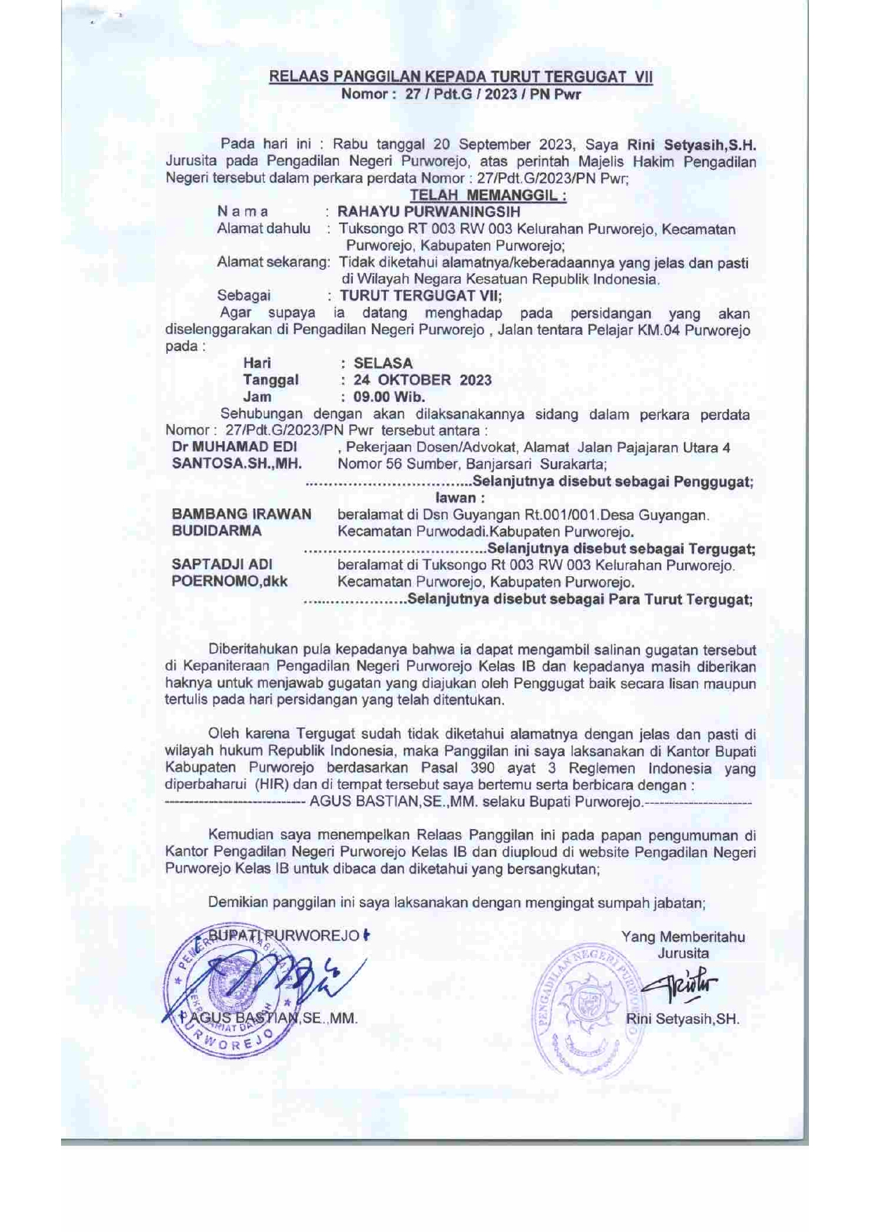 20 Oktober 2023 Relaas Panggilan Kepada Turut Tergugat VII Nomor : 27 / Pdt.G / 2023 / PN Pwr an Rahayu Purwaningsih Alamat dahulu : Tuksongo RT 003 RW 003 Kelurahan Purworejo, Kecamatan Purworejo, Kabupaten Purworejo on Jumat, 20 Oktober 2023. Posted in Relaas Panggilan Umum Continue Reading